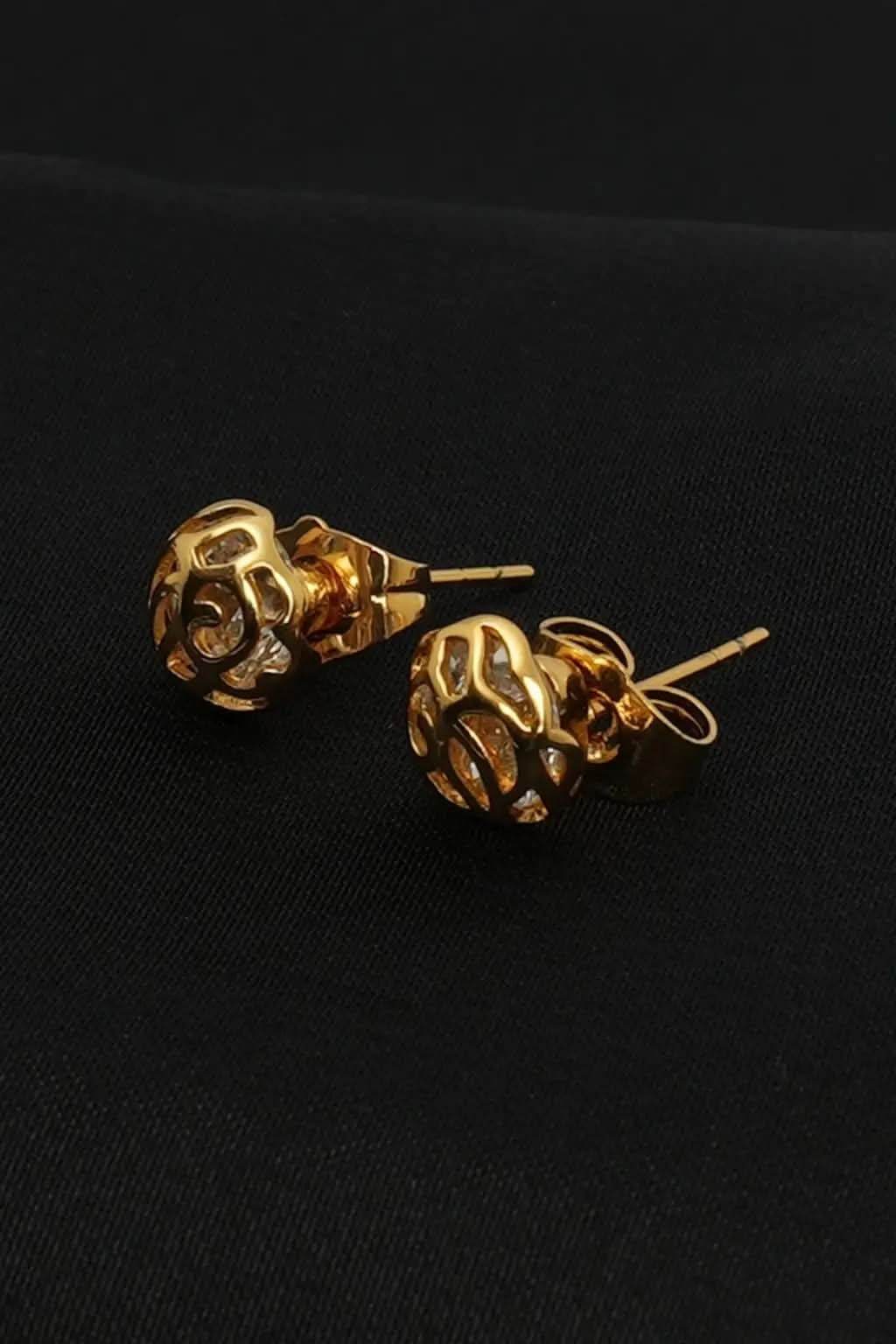 Embrace elegance with Ecowear's Floral Cage Stud Earrings – a captivating blend of intricate design and modern sophistication. Featuring a delicate gold-tone floral cage adorned with shimmering crystal accents, these earrings exude charm and grace, making them the perfect accessory for any occasion.