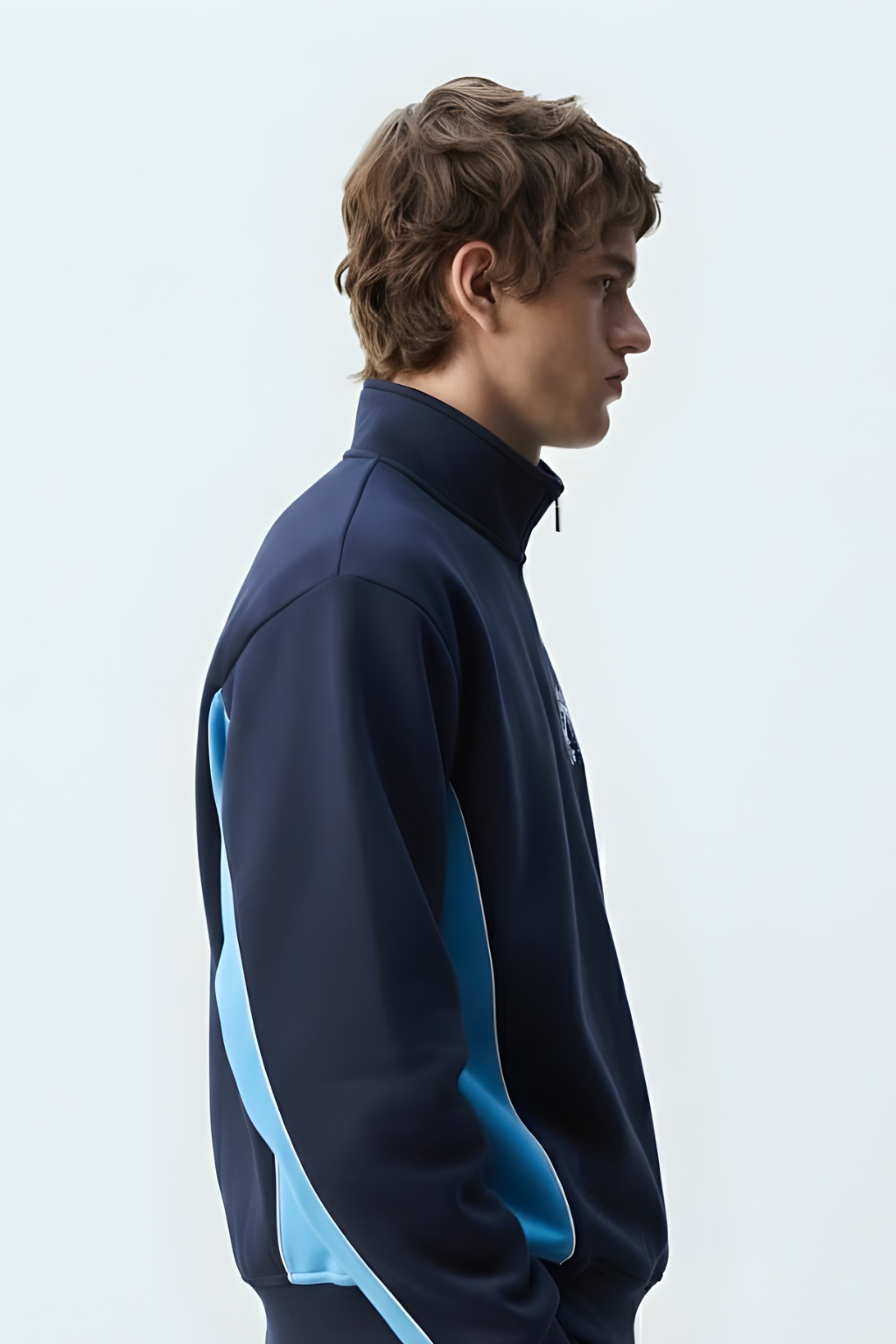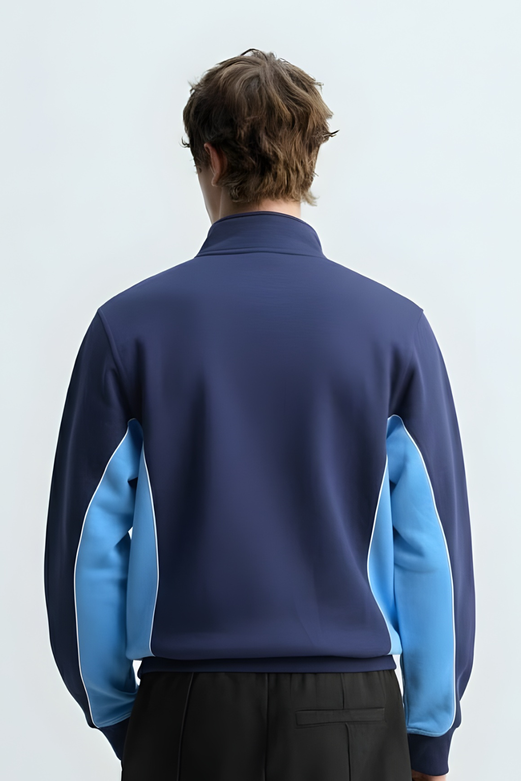 A refined sportswear piece with a modern color contrast. This navy quarter-zip sweatshirt features sky-blue side panels outlined with white piping, complemented by an embroidered chest logo. Designed for both comfort and performance, it offers a relaxed fit ideal for everyday wear or active routines.