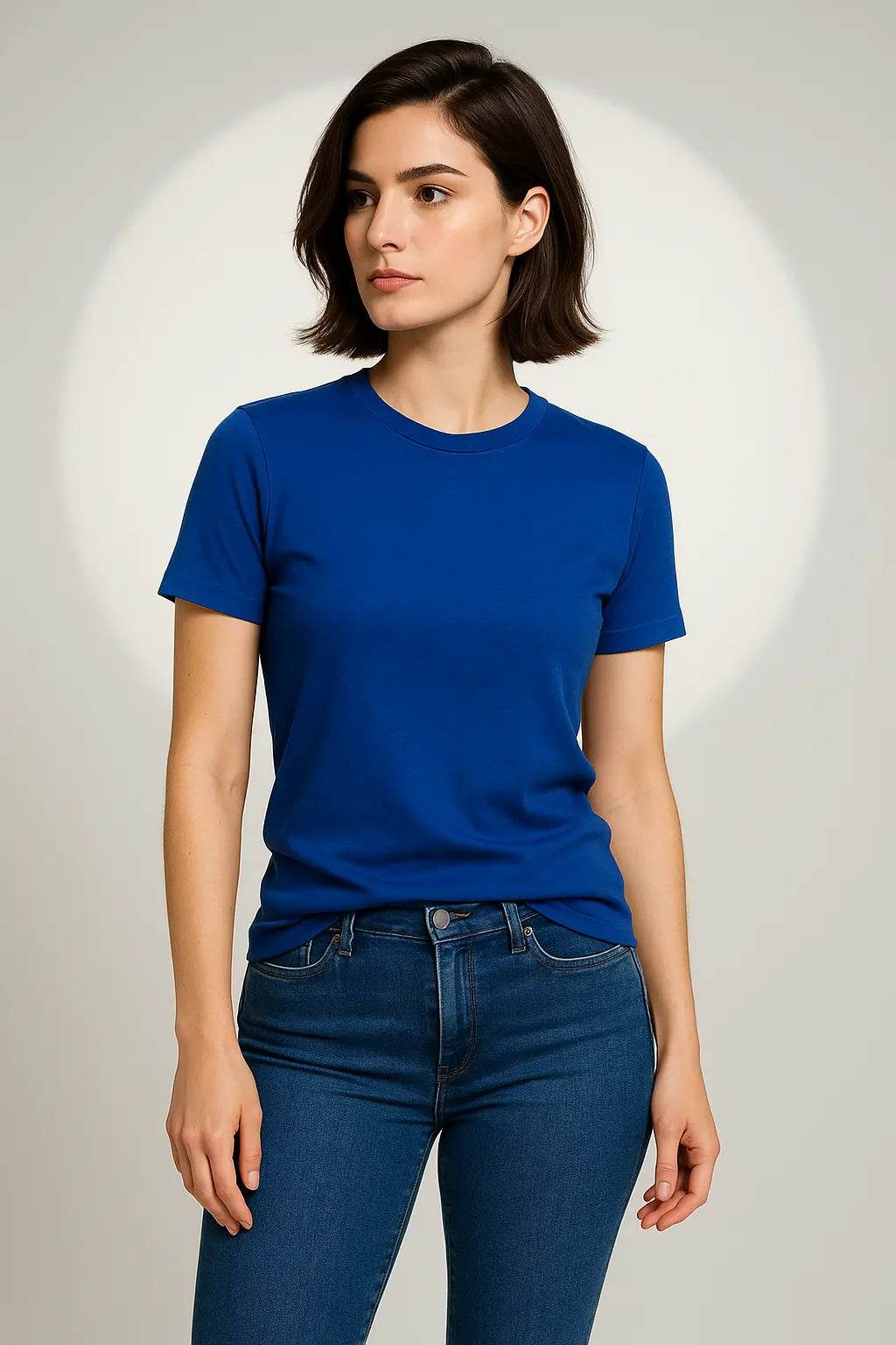 Add a pop of color to your everyday style with this classic blue crew neck t-shirt for women. Designed for comfort and simplicity, this wardrobe essential is crafted from premium cotton for a soft feel and a flattering fit. Whether you're dressing it up with layers or keeping it casual, this t-shirt delivers all-day comfort with timeless appeal.
