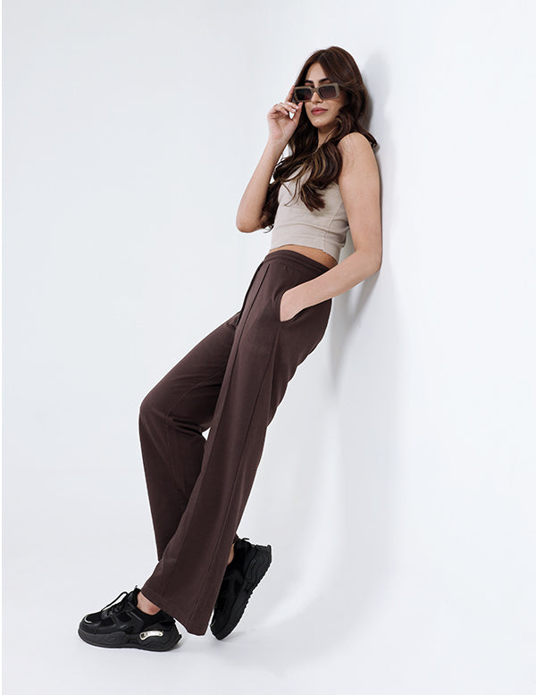 These chocolate brown straight-leg trousers are designed for both comfort and style. Crafted from soft, breathable fabric, they feature a relaxed fit with a subtle front seam that adds structure. The drawstring waist ensures a customizable fit, making them ideal for daily wear or casual outings.