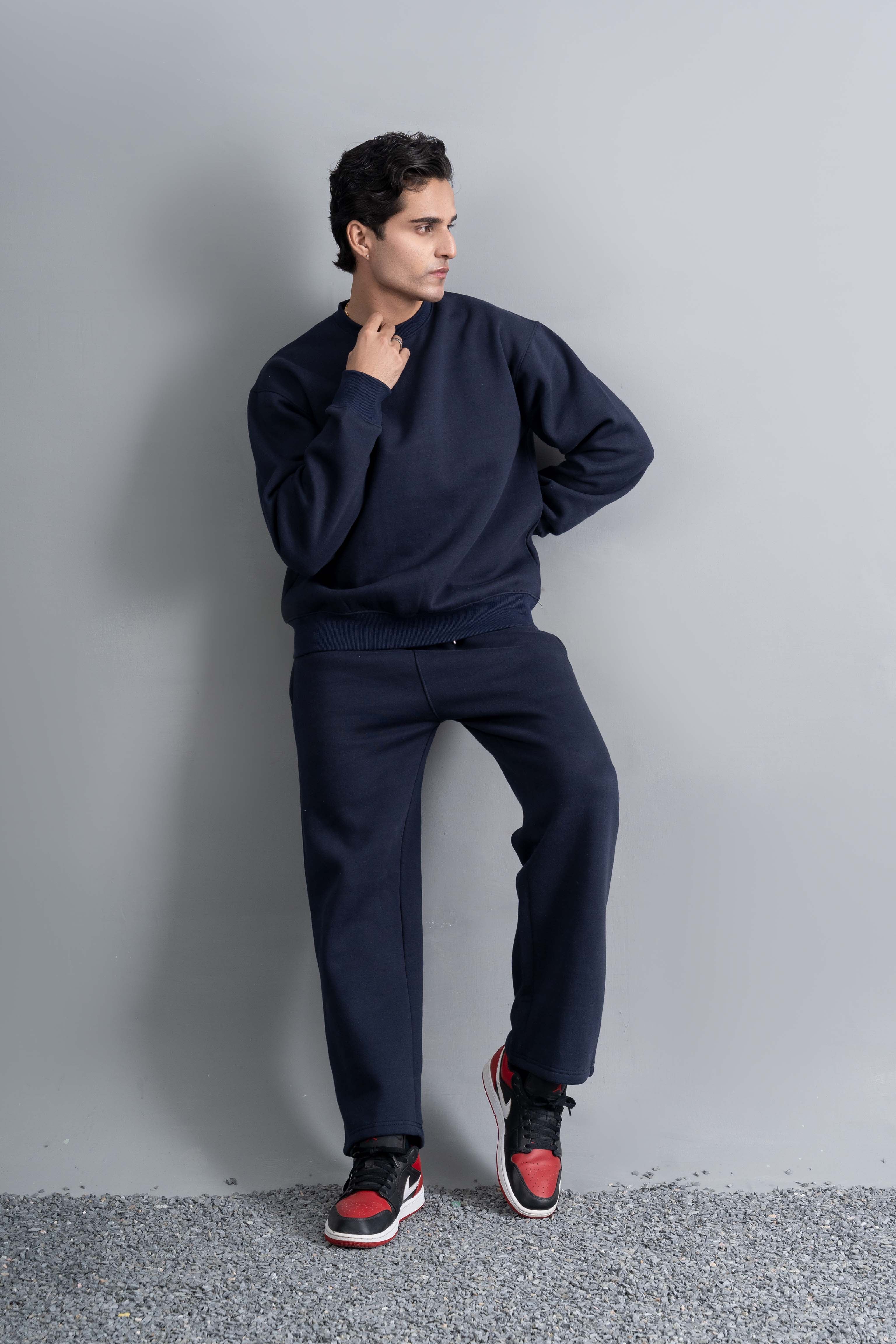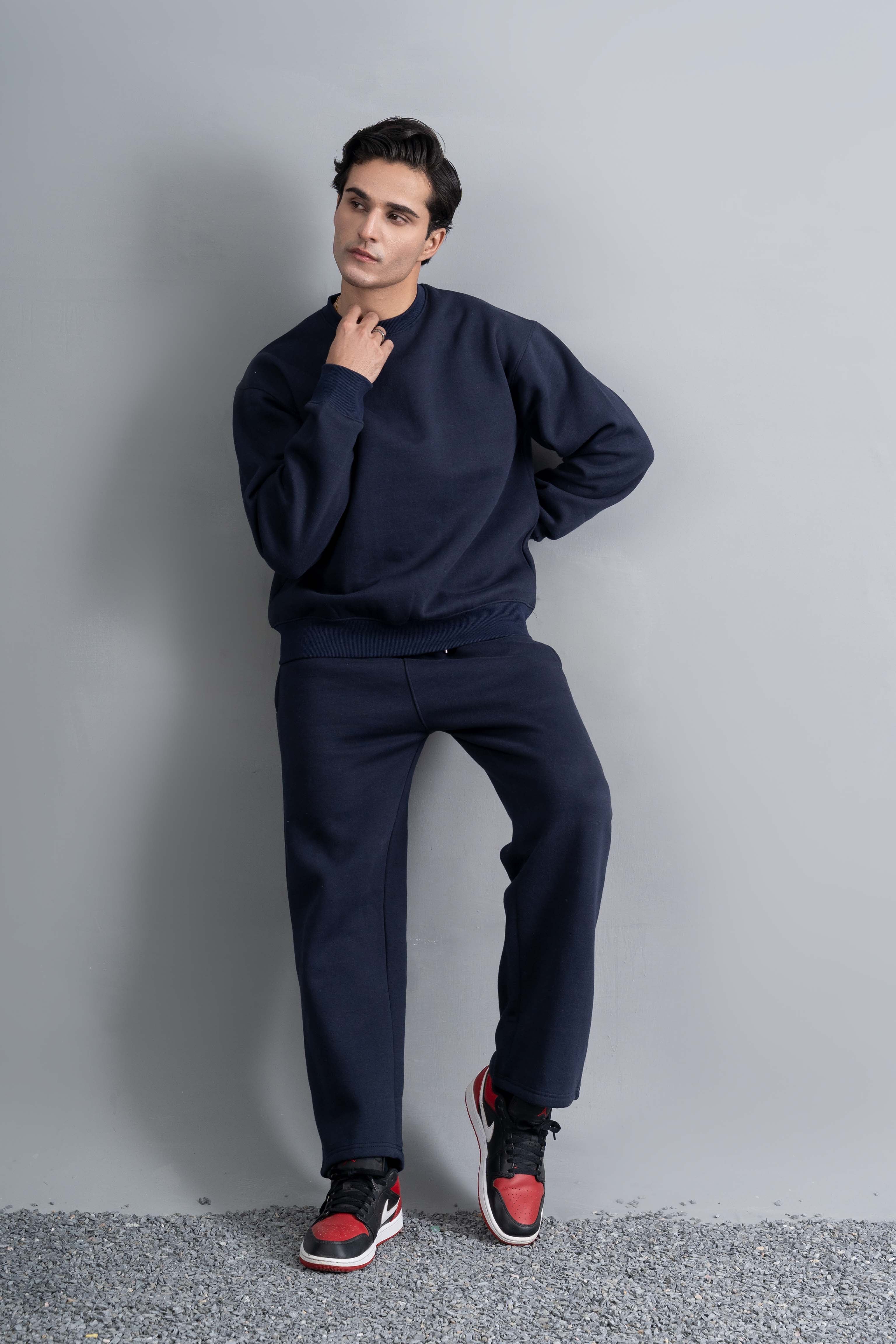 A simple everyday two-piece set designed for comfort. The crewneck sweatshirt fits relaxed and soft, paired with straight trousers for easy movement. Deep navy tone keeps it clean, wearable and always in style.