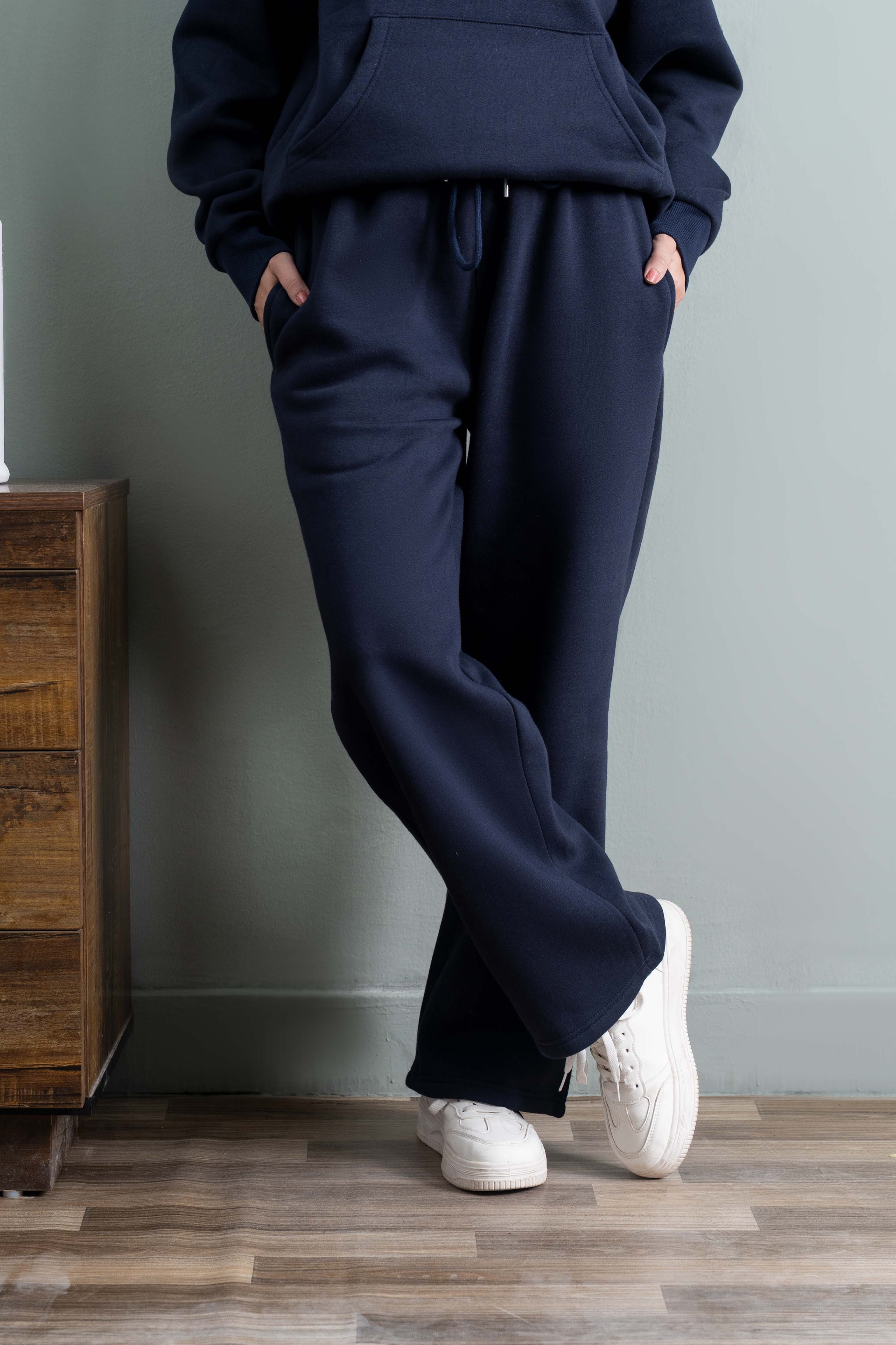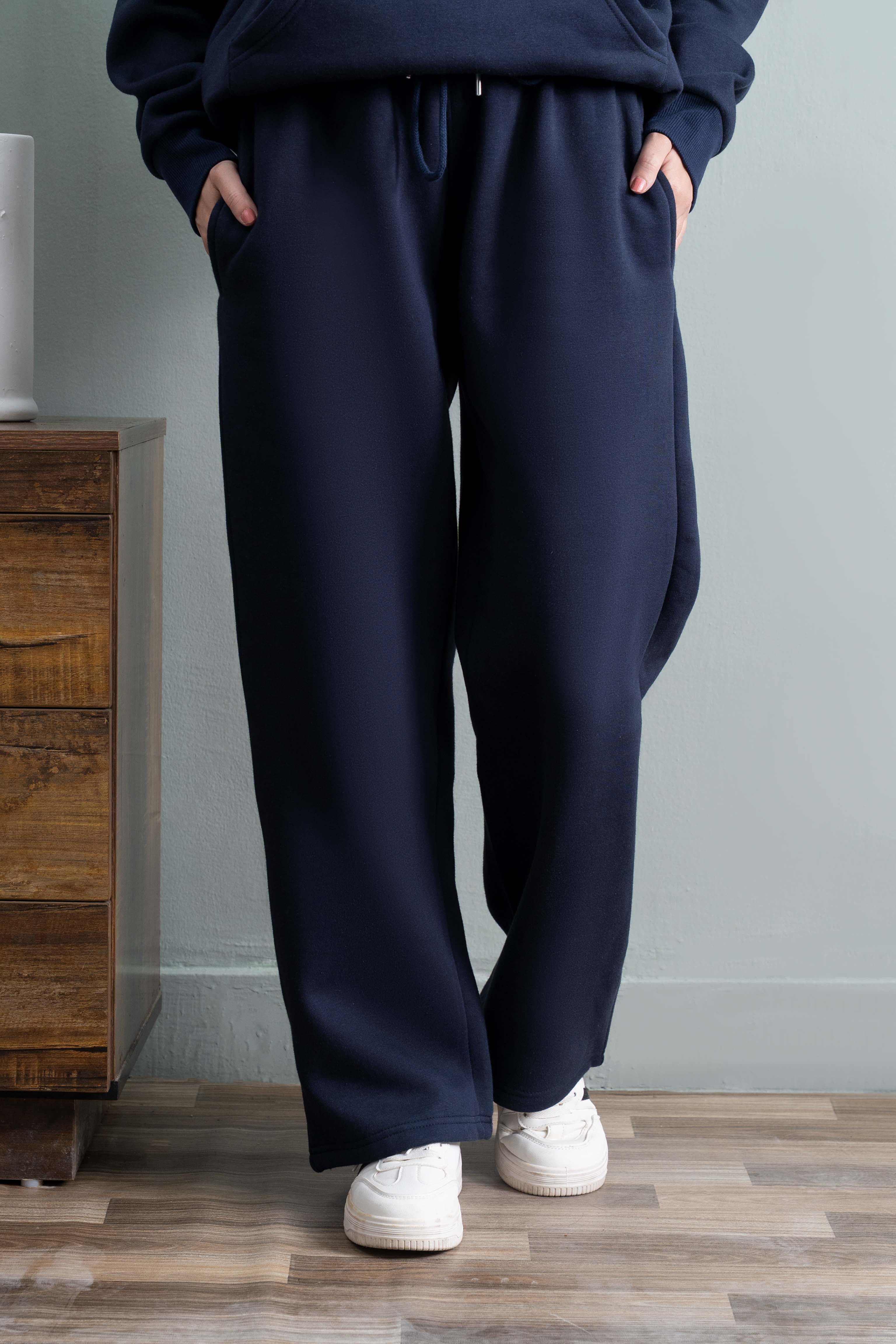 These navy straight-leg trousers offer a relaxed fit with a smooth, soft feel that’s easy to wear every day. The wide leg gives them a flattering fall, while the elastic waistband keeps them comfortable for long hours. They pair well with matching hoodies and sweatshirts for a coordinated look.