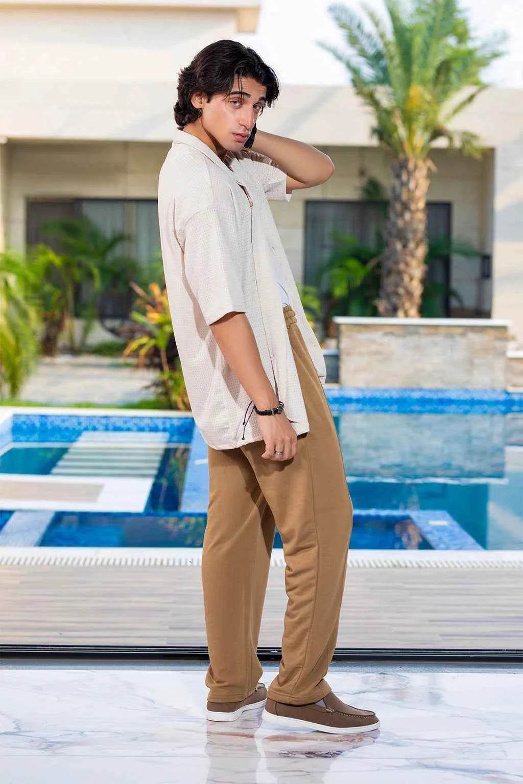 Crafted from high-quality materials, the cream textured shirt offers a soft feel against the skin, while the green trousers provide an effortlessly chic look. The unique texture of the shirt adds a touch of sophistication, elevating any casual outfit into a stylish ensemble.