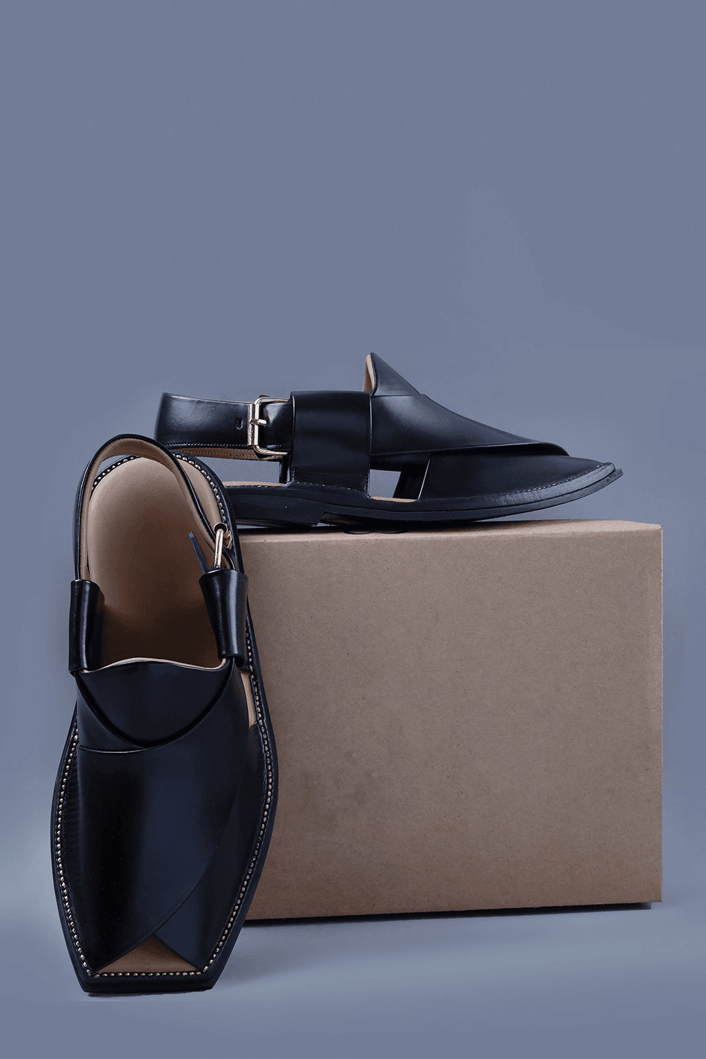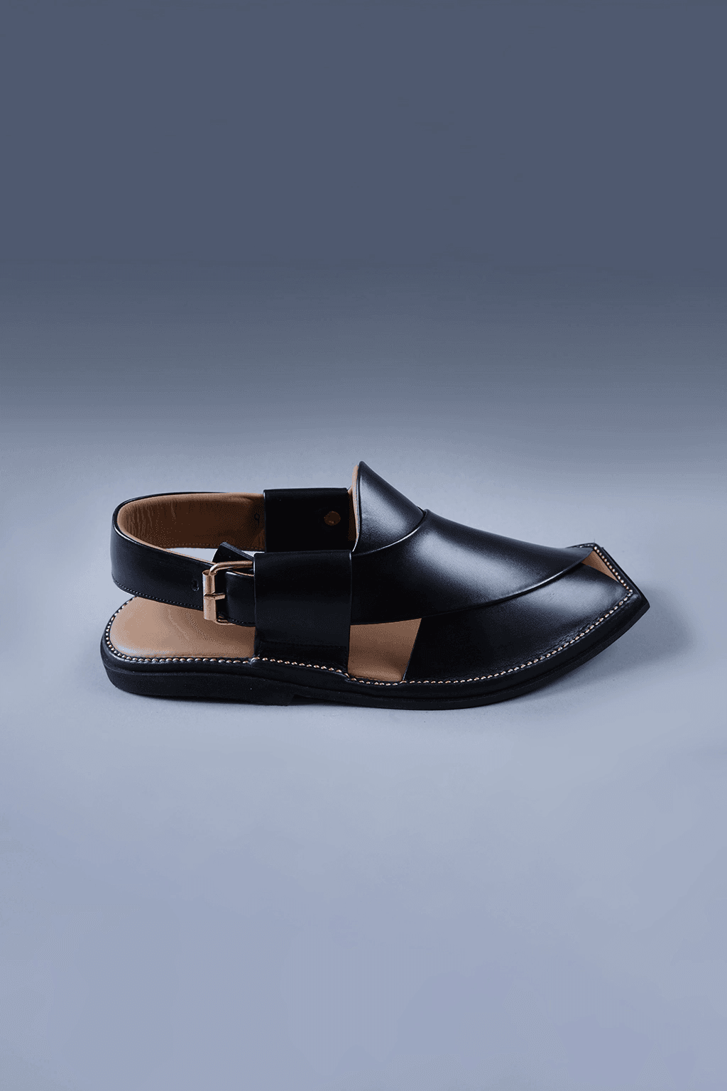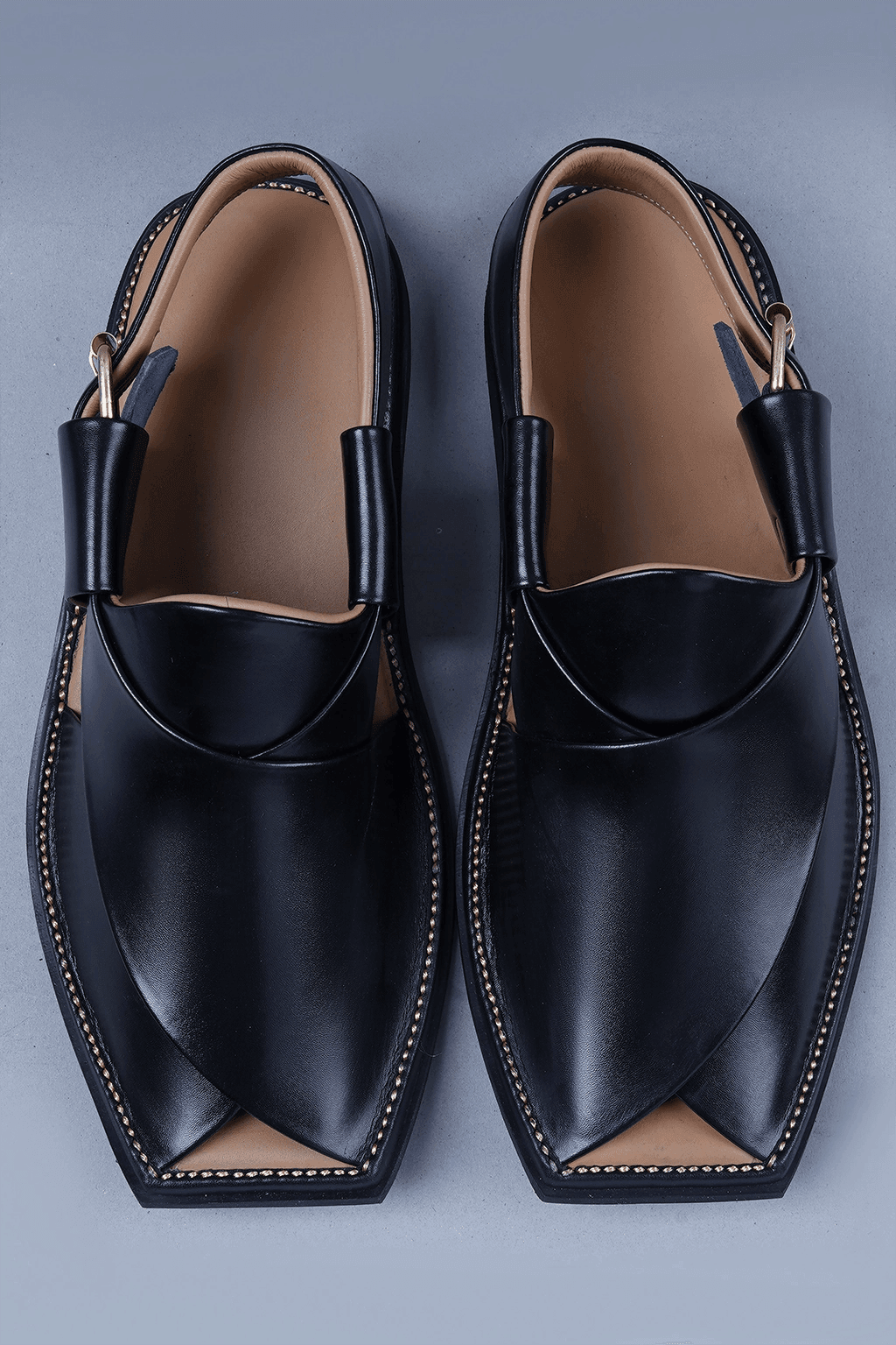 This black leather Charsadda chappal features a bold square toe and a traditional silhouette, enhanced with a premium brass buckle. Handcrafted for comfort and heritage, it’s a perfect blend of style and culture.