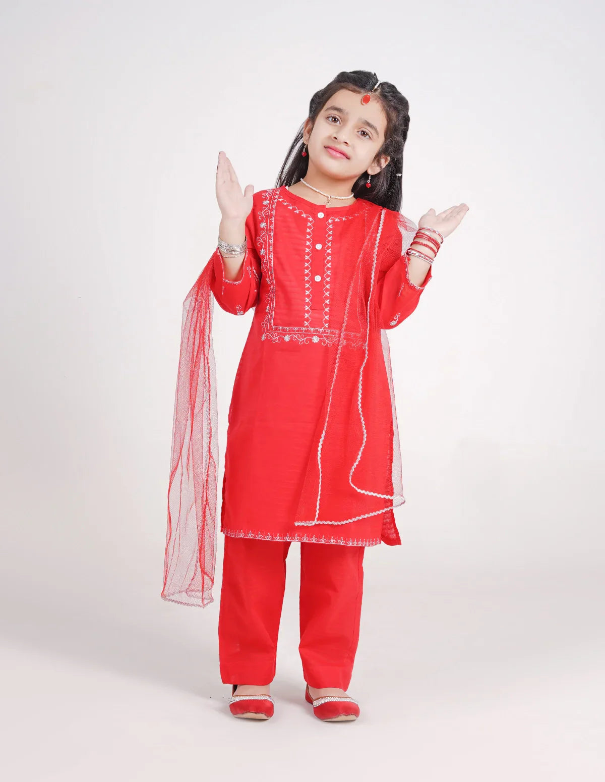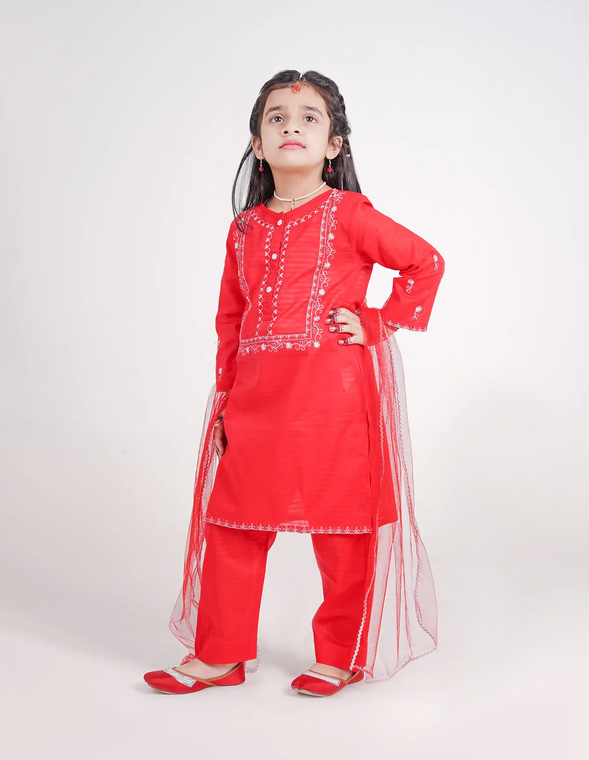 Dress your little one in this stunning Embroidered Red Trouser Set, perfect for festive and formal occasions. The intricate white embroidery on the vibrant red kurti adds a graceful touch, while the matching trousers and delicate net dupatta complete the elegant look. Comfortable, stylish, and effortlessly charming!