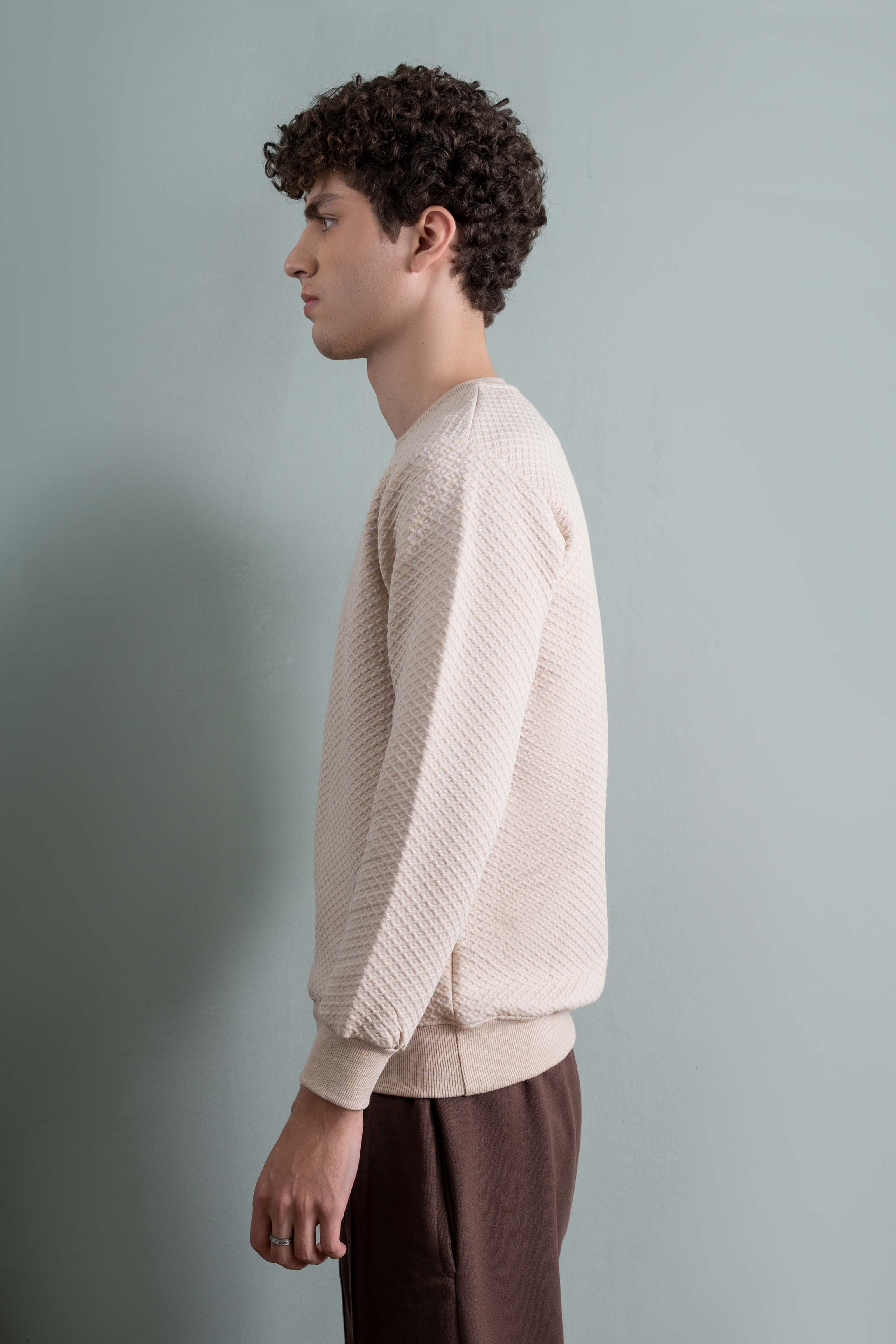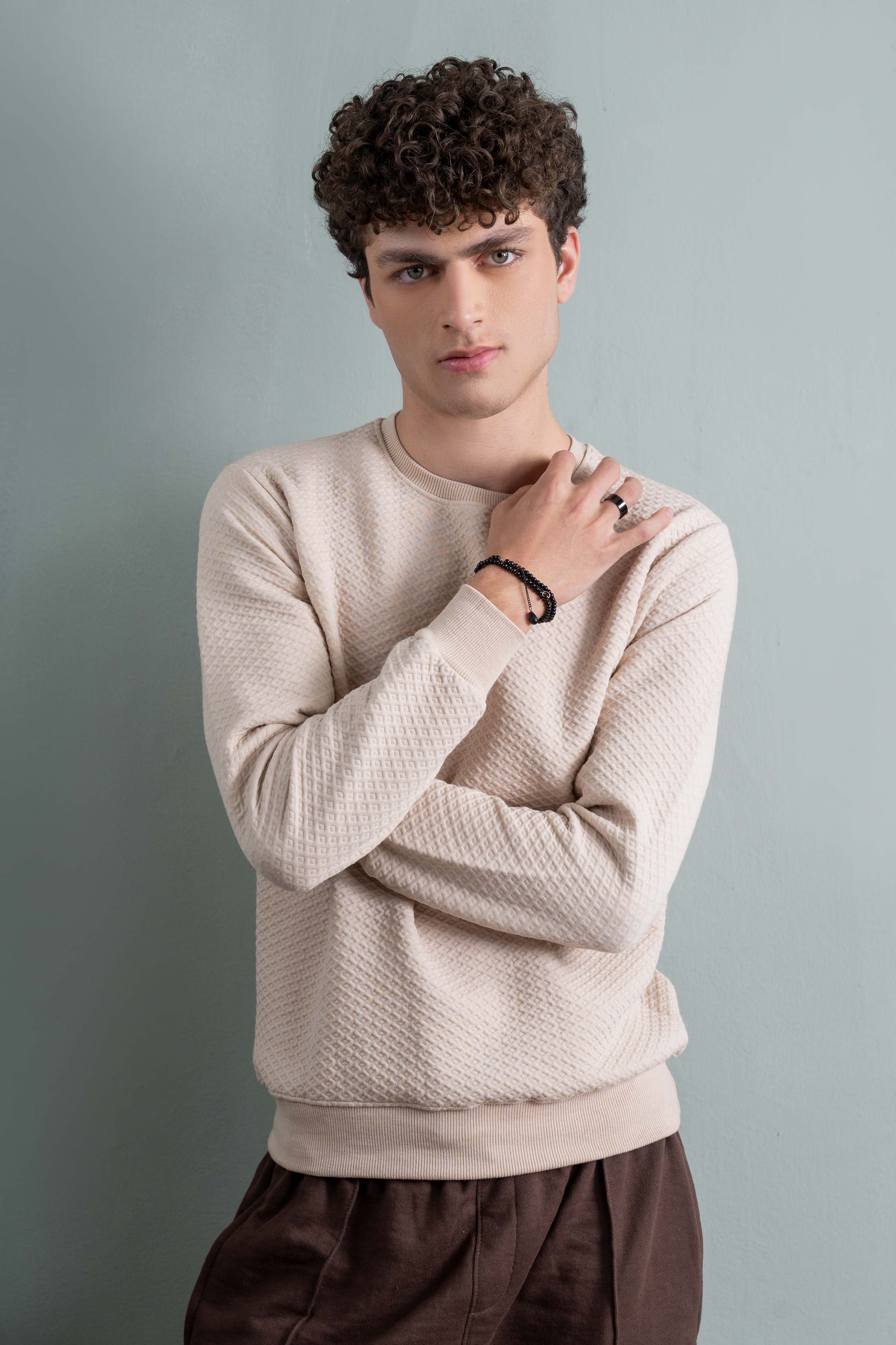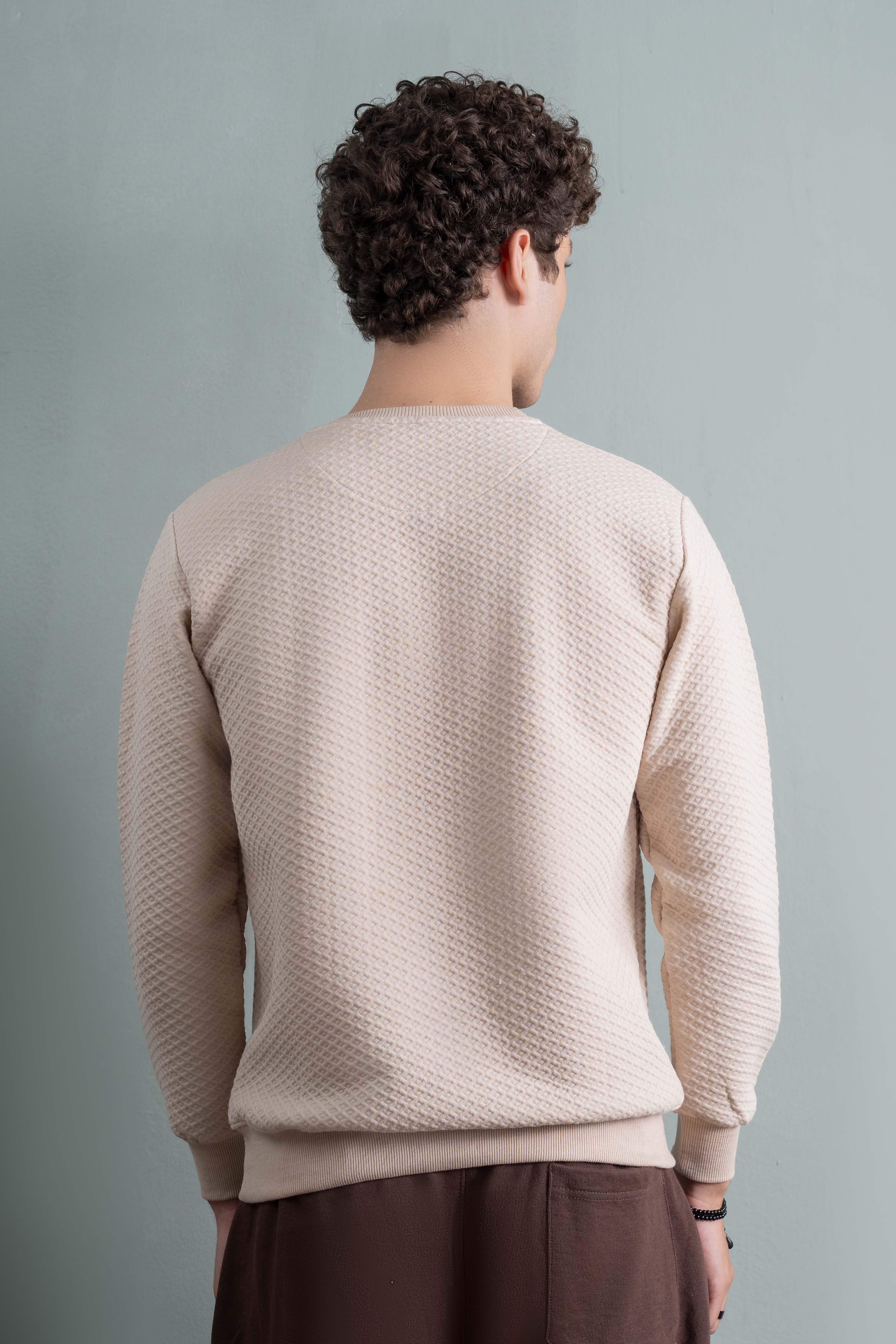 This beige textured sweatshirt gives a clean and relaxed look while staying warm and comfortable. The soft knit pattern adds a subtle detail that makes it stand out without being too loud. It’s easy to style and works well for everyday wear, whether you’re indoors or out.