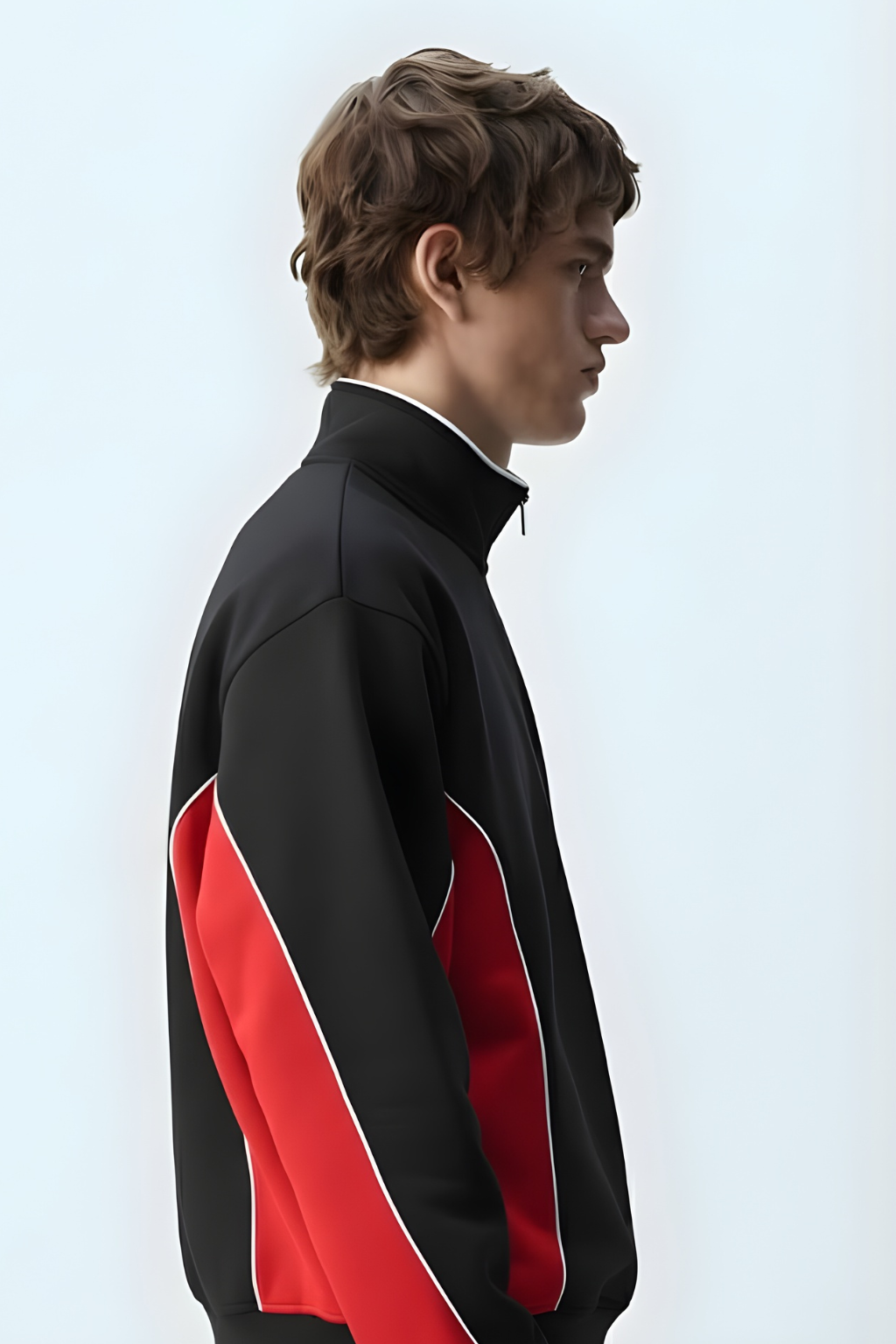 A sporty essential that blends comfort with style. This black half-zip sweatshirt features bold red side panels with white piping for a striking contrast. Designed with a stand-up collar and ribbed finishes, it delivers both a modern look and cozy warmth for casual or active wear.