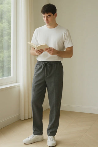 - Casual Look: Pair your Slate Drift charcoal grey trousers with a simple white tee and sneakers for a relaxed look, perfect for errands or coffee dates.