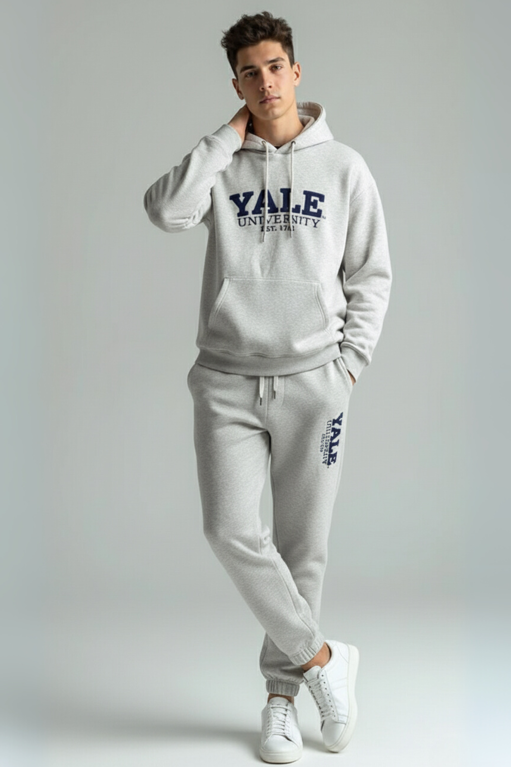 This cozy grey co-ord set combines comfort with a classic collegiate look. The hoodie and joggers feature bold “Yale University” lettering for a timeless sporty vibe. Made from soft fleece fabric, it’s perfect for relaxed days, study sessions, or casual outings.