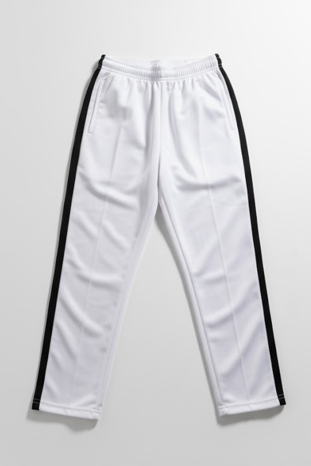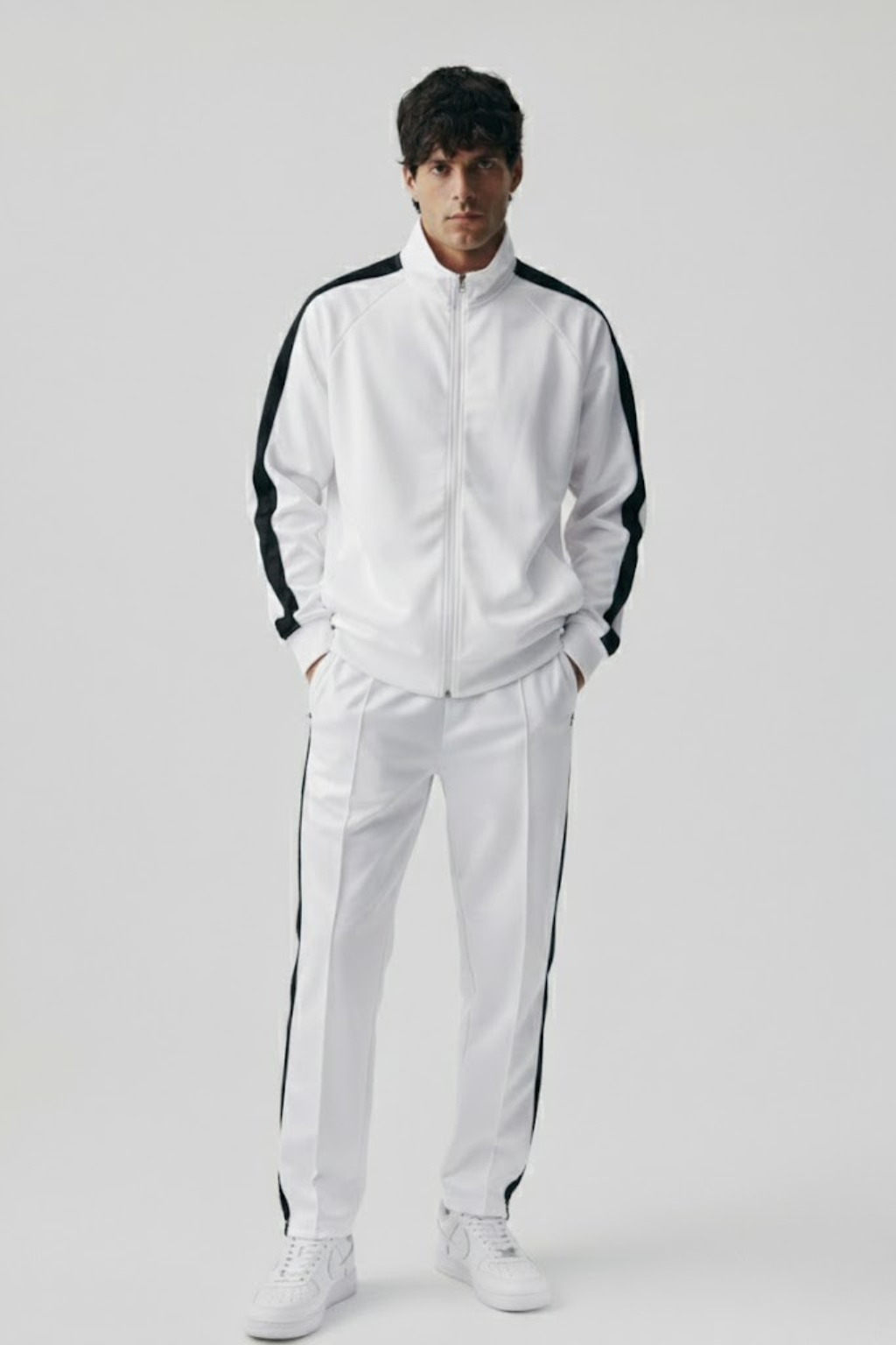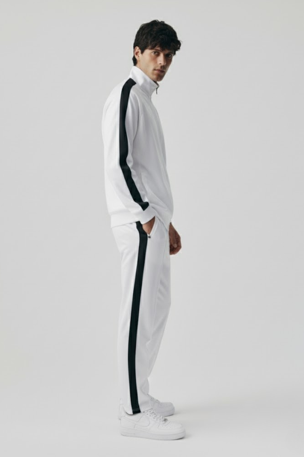 This white panel tracksuit has a clean athletic look with smooth fabric and sharp black side stripes. The jacket comes with a full zip and a stand collar for a sporty feel, while the matching pants keep a straight, comfortable fit. It’s an easy option for training, casual wear, or a fresh everyday style.