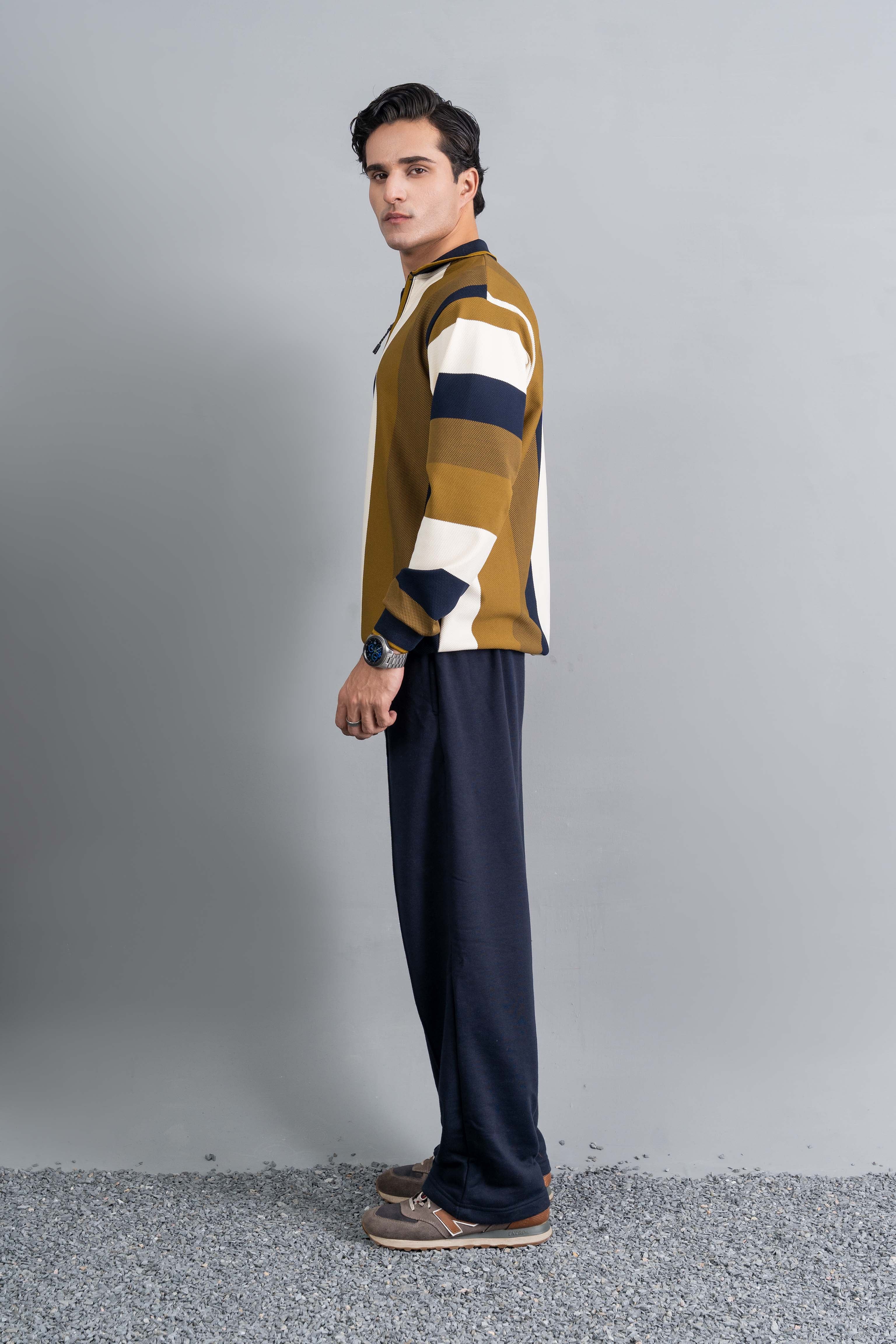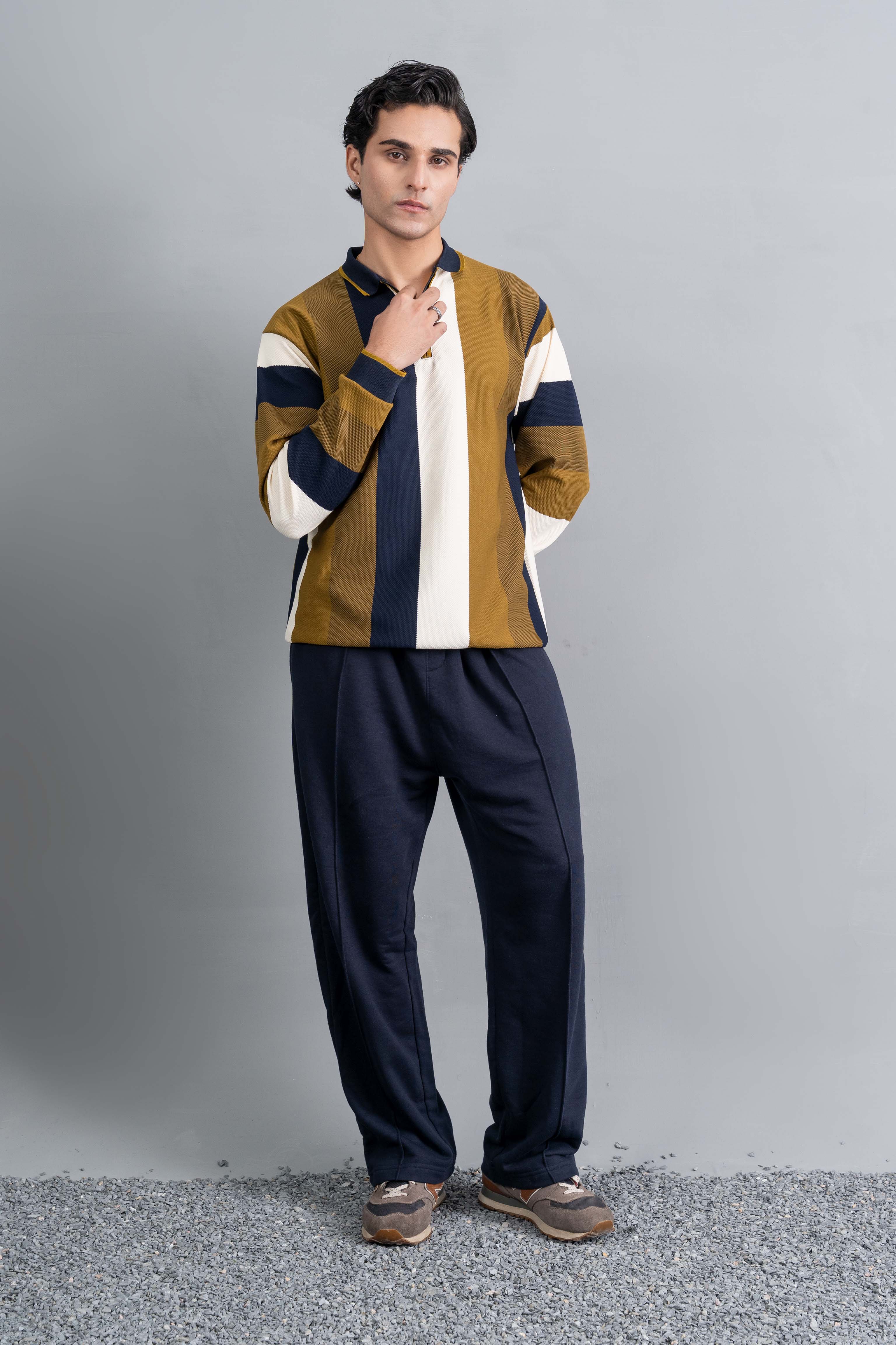 A modern co-ord pairing featuring a bold striped sweatshirt in navy, mustard and ivory, matched with relaxed fit navy trousers for a clean, effortless look. Ideal for daily wear with comfort, movement and style balanced in one outfit.