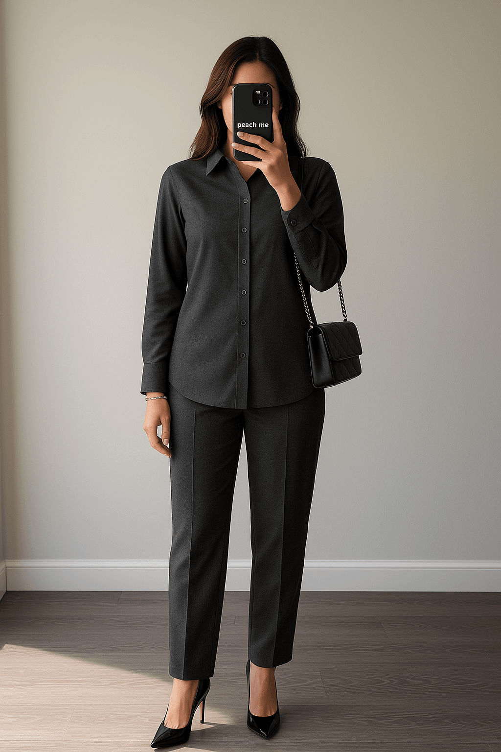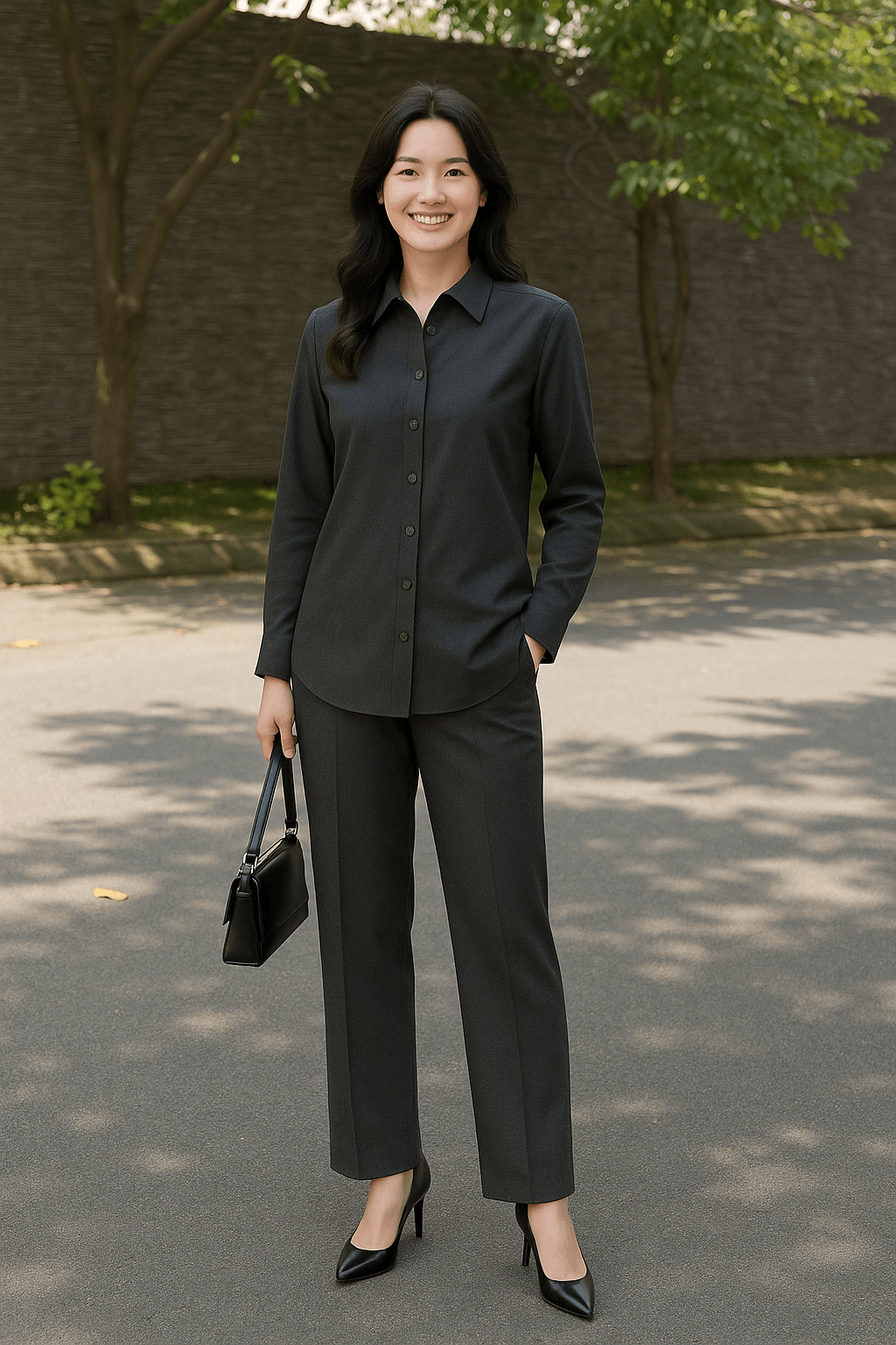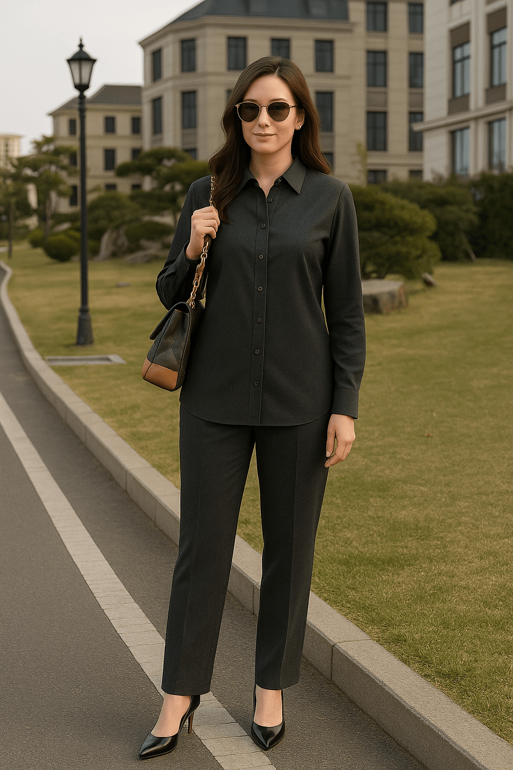 The matching trousers are designed with a sleek silhouette, ensuring you move comfortably throughout your busy day. The charcoal grey color is not only timeless but also easy to pair with various accessories, allowing you to express your personal style. Made for everyday wear, this outfit suits both formal meetings and casual Friday vibes.