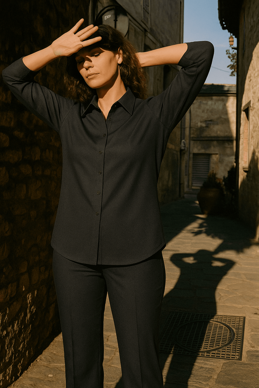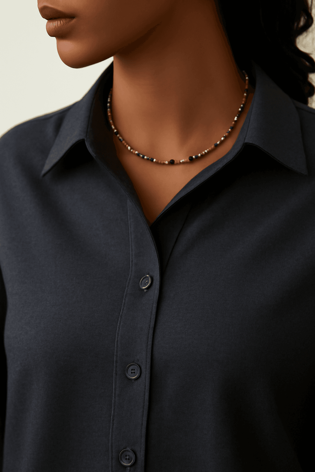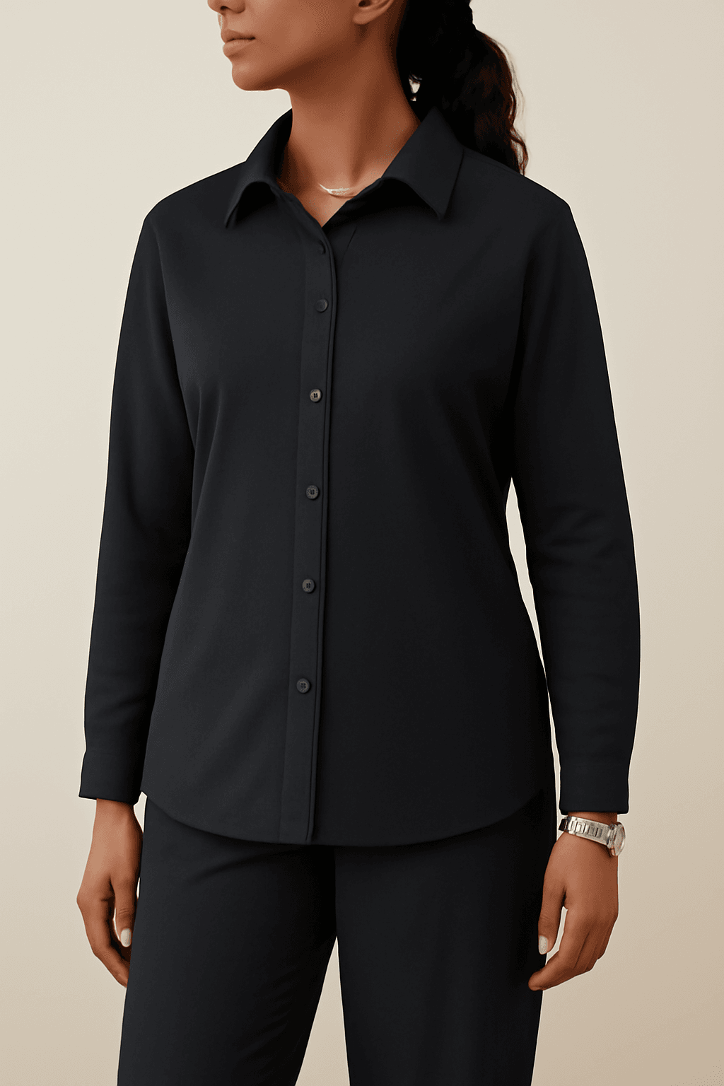 The Charcoal Grey Two-Piece Co-Ord Set is a stylish and versatile choice perfect for the modern workplace. Crafted from premium export-quality fabric, this women's two piece outfit for work offers both comfort and sophistication. The tailored fit of the shirt features a classic collar and button-down design. This adds a polished touch to your professional look.
