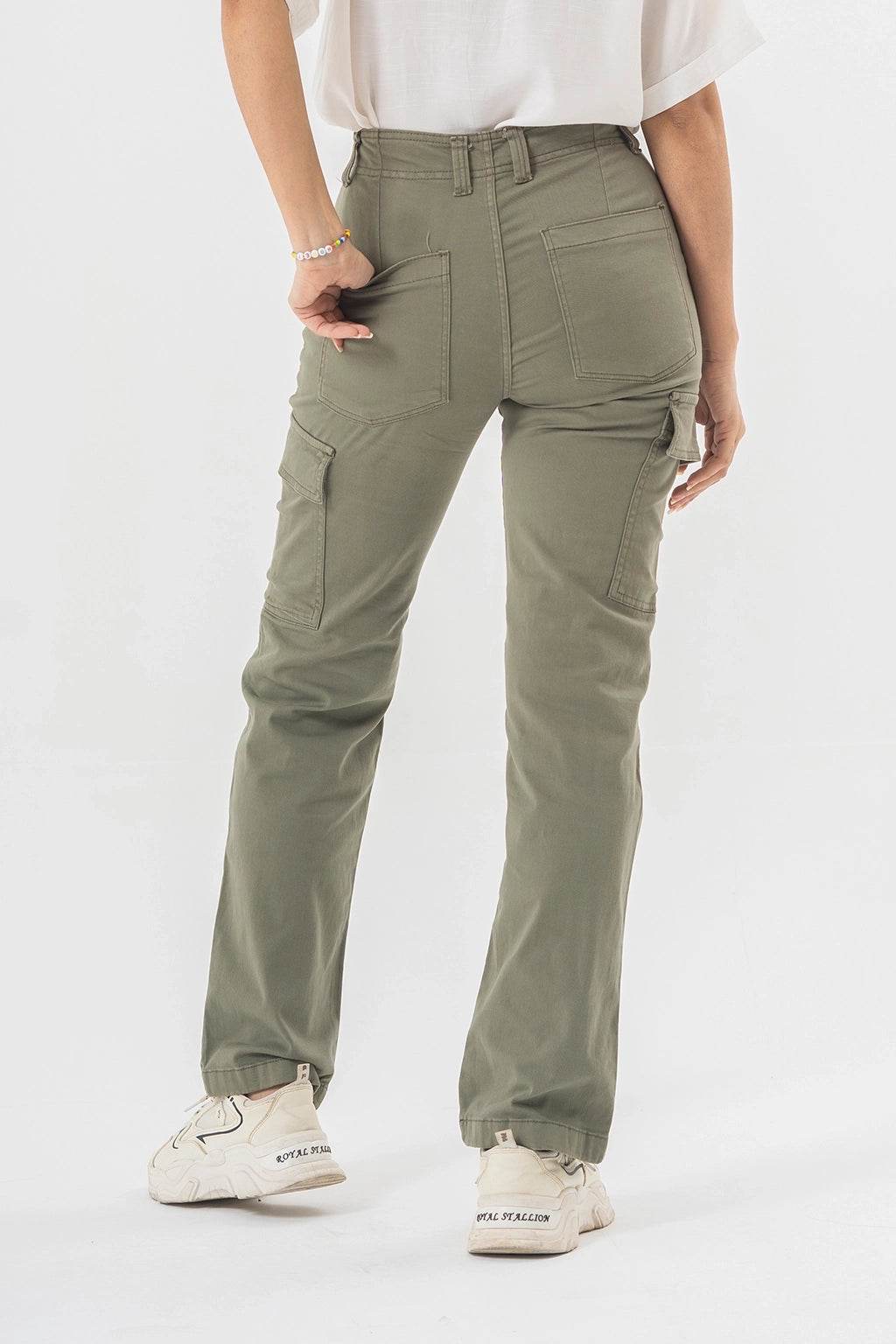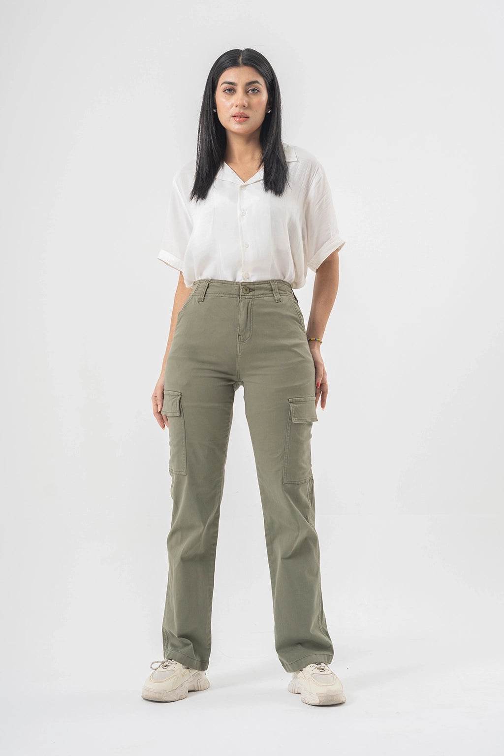 High Waist Cargo Pants in Olive Green with Side Flap Pockets - Straight Fit Style