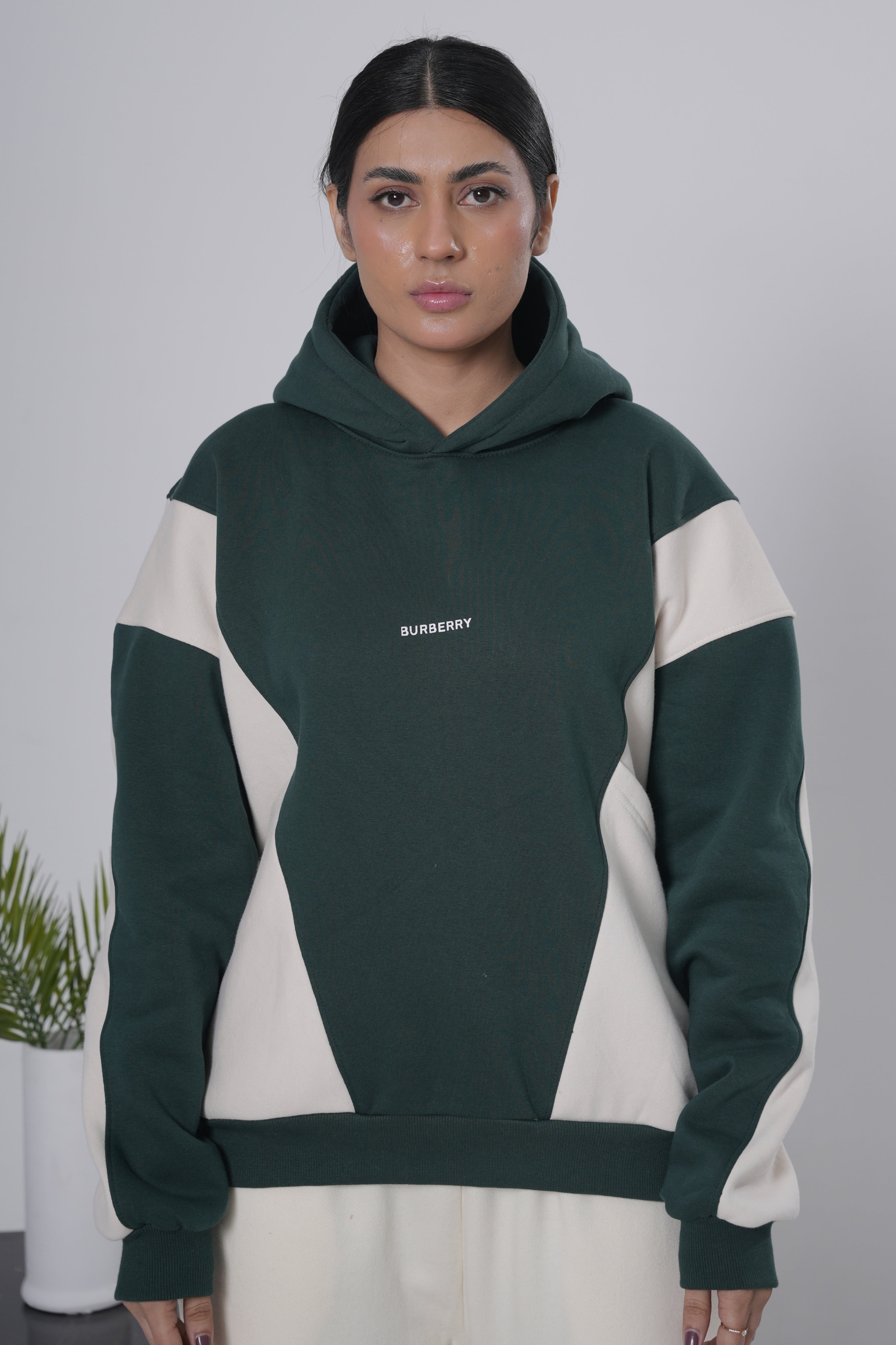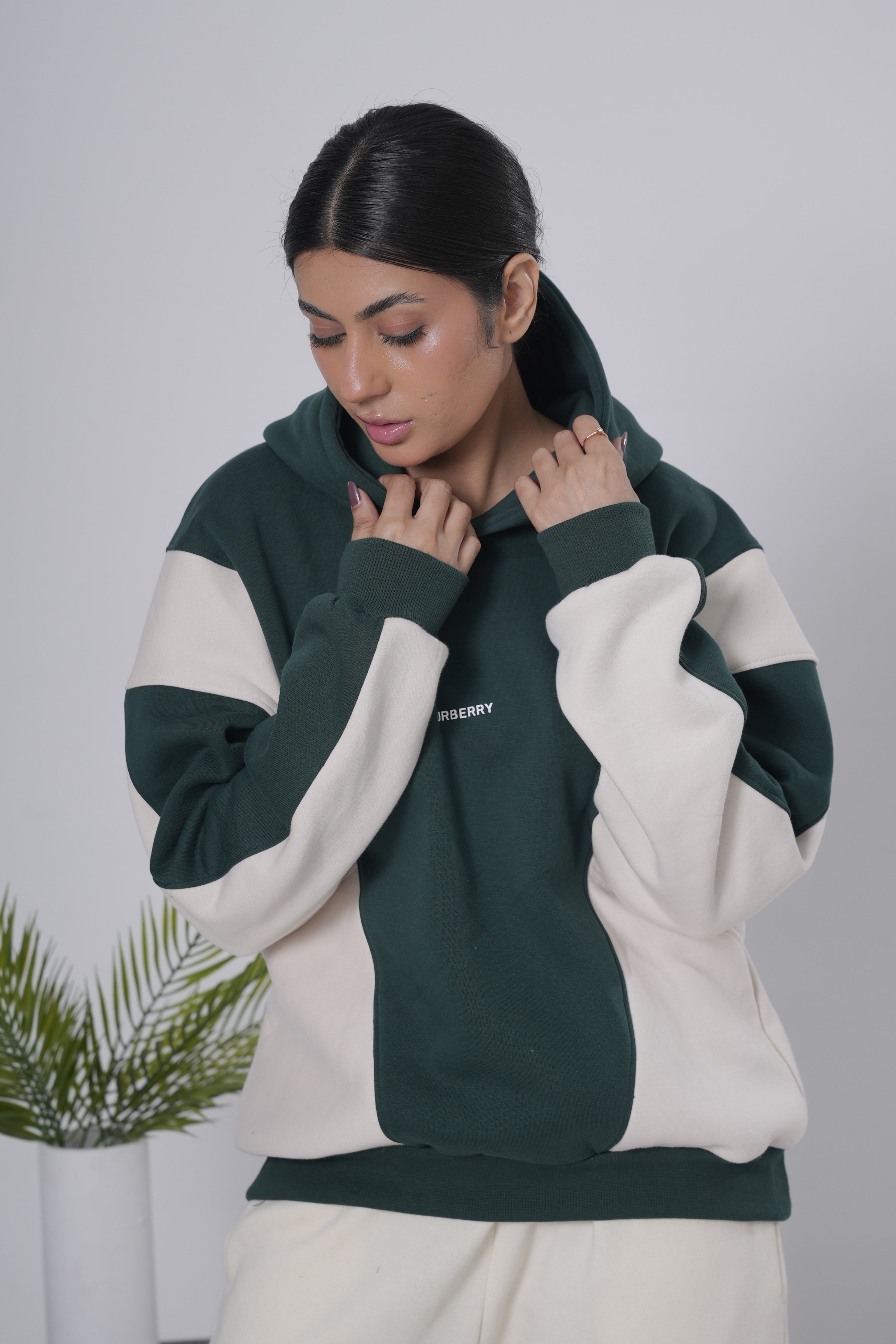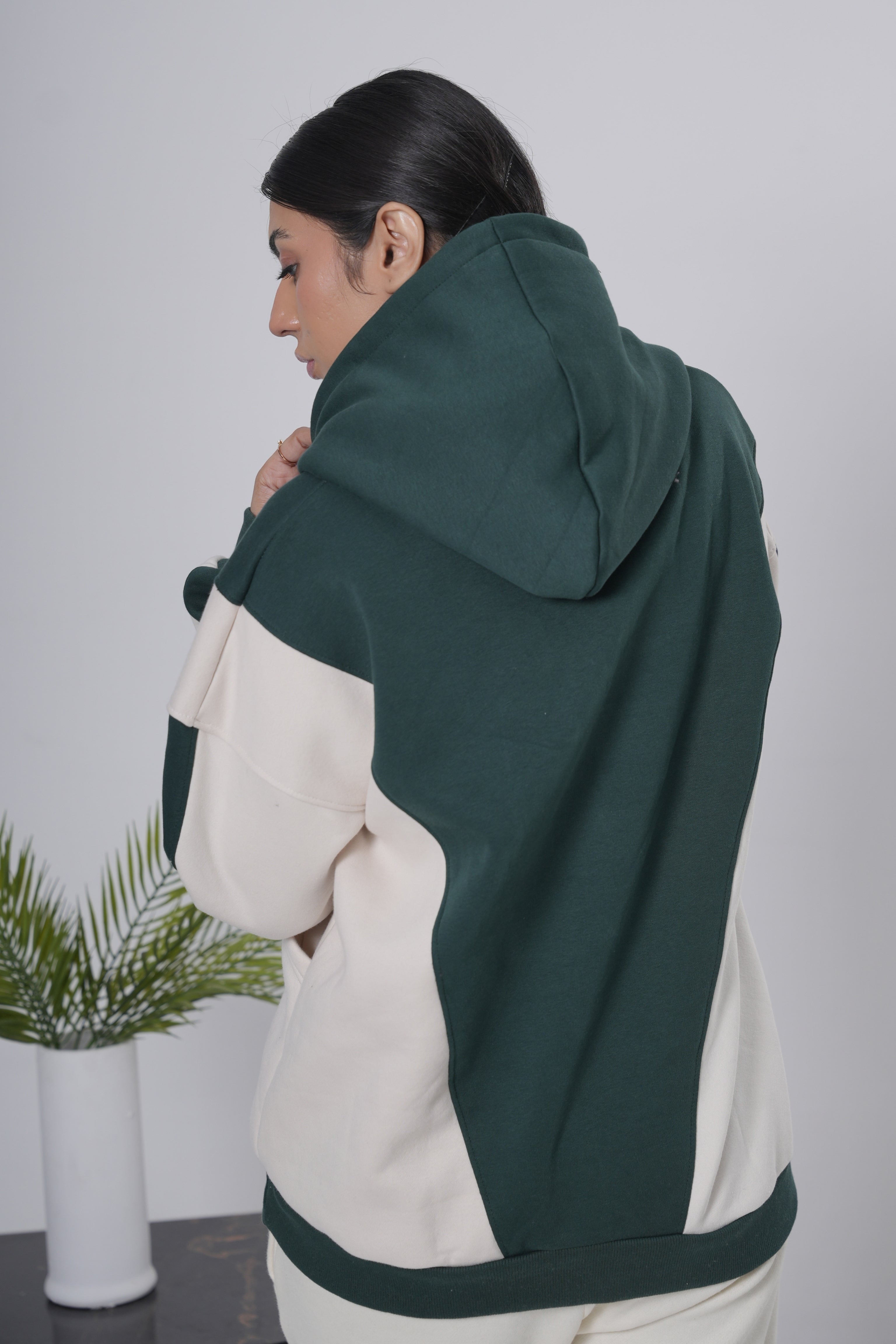 Forest Green & Off-White Color Block Hoodie