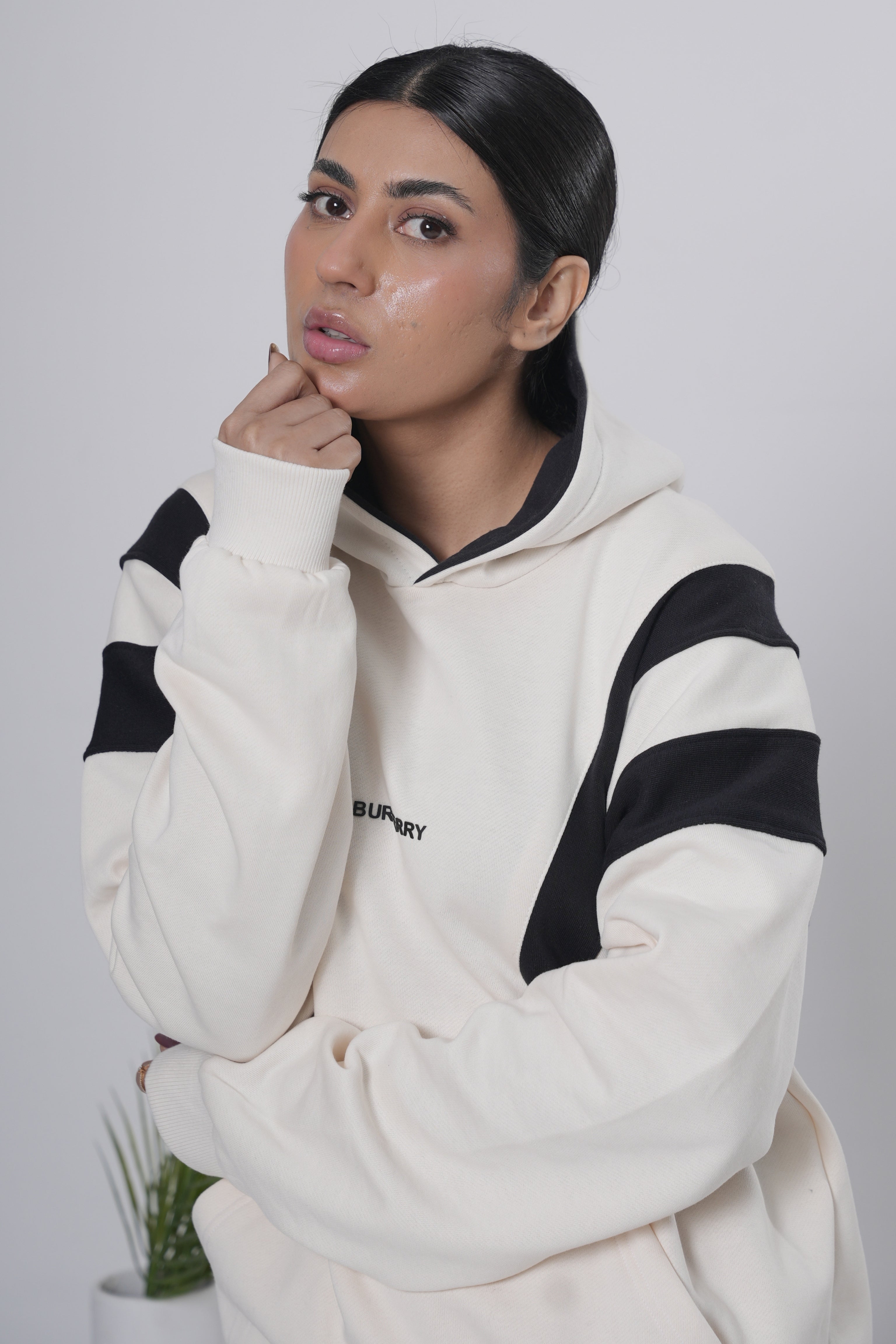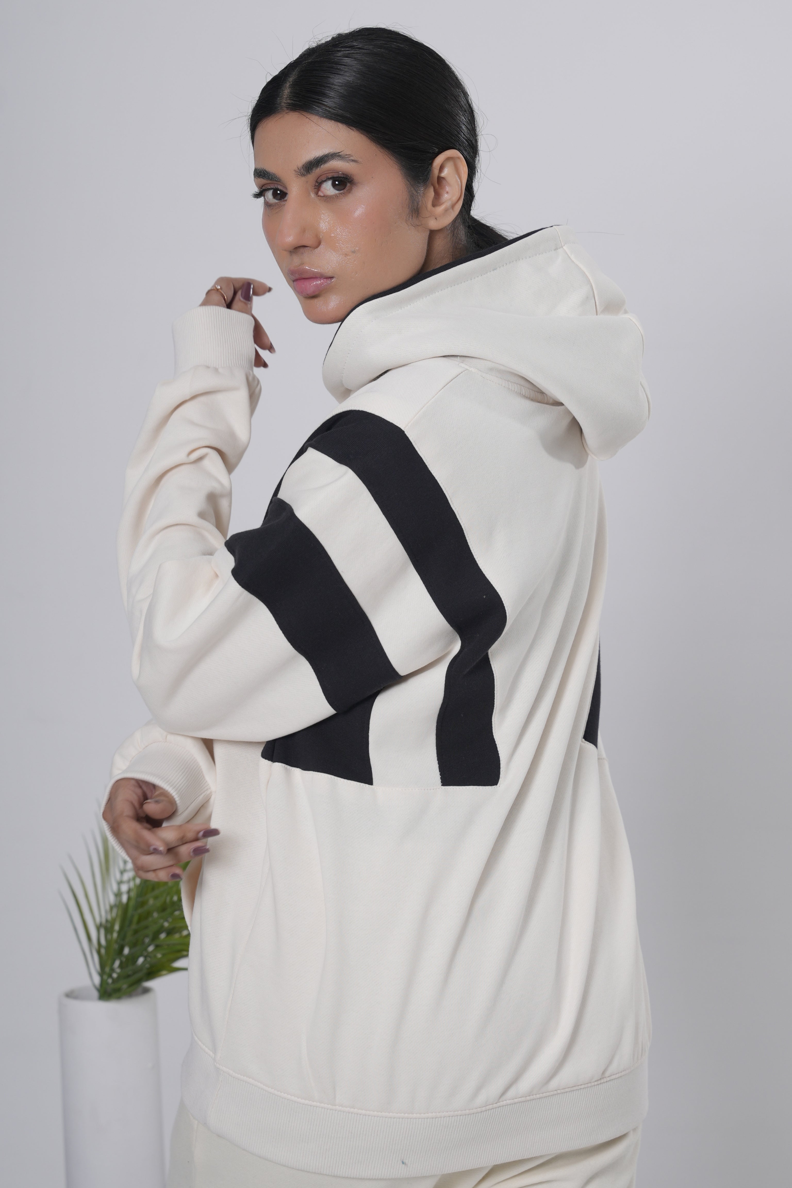 Bold color-block detailing in off-white with black sleeve accents