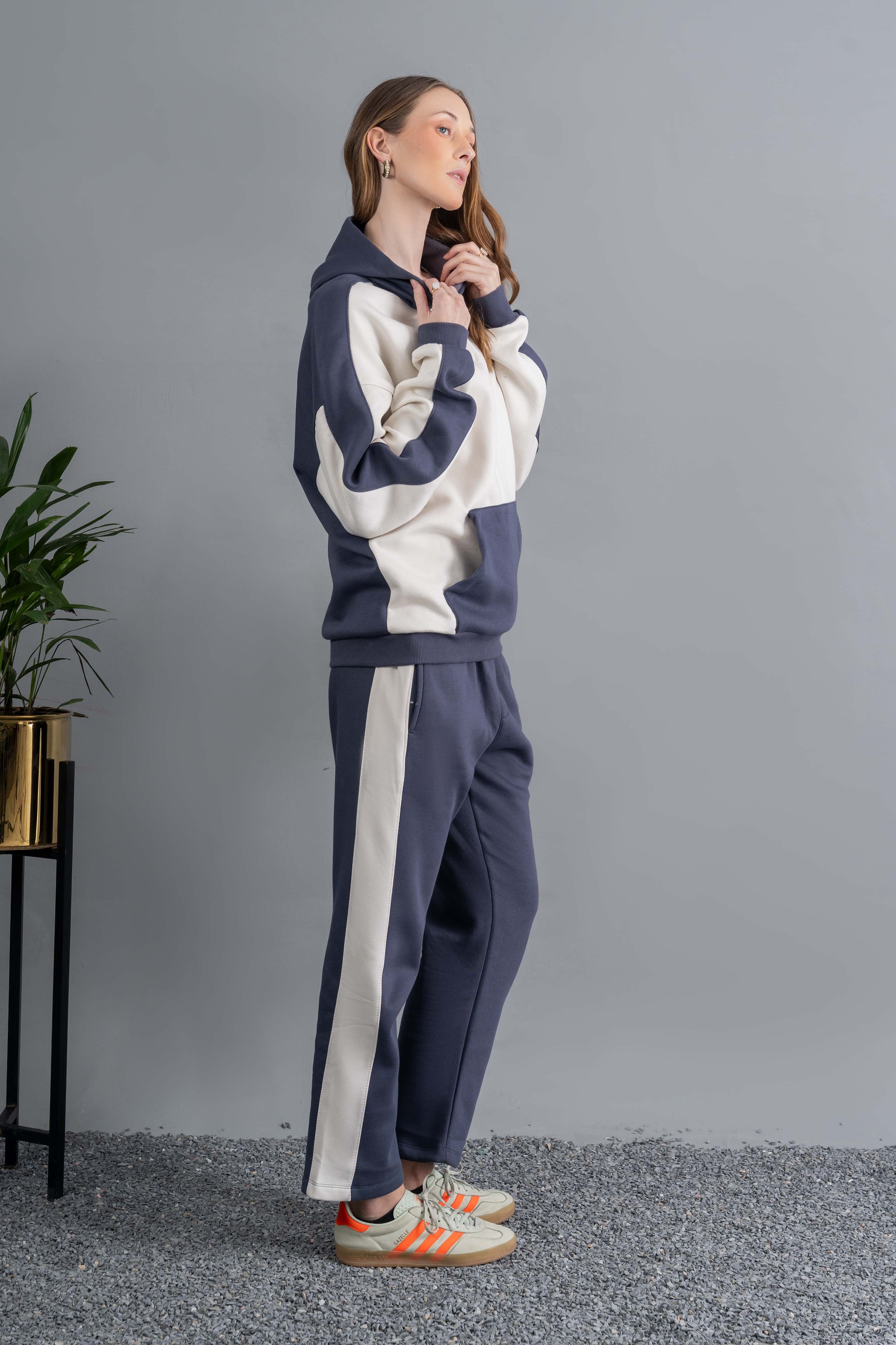 A clean two-tone tracksuit set in slate blue and ivory, built for comfort and everyday wear. The hoodie features a kangaroo pocket and smooth contrast paneling, paired with straight-fit trousers finished with an ivory side stripe. Soft, easy to move in, and perfect for casual days or layering up in a minimal street style look.