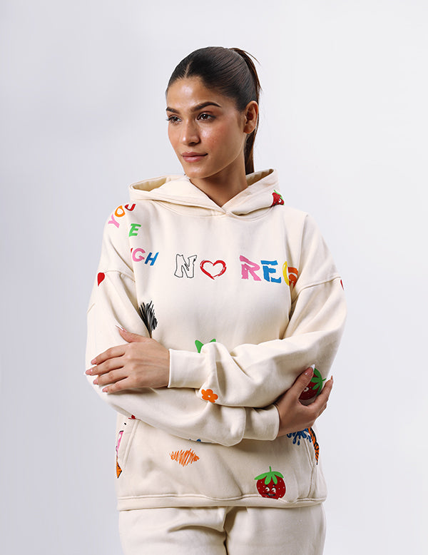 Bring playful energy to your casual days with this off-white printed tracksuit set. Featuring a cozy hoodie with colorful graphic prints and matching sweatpants, it blends comfort with bold style. Made from soft fleece fabric, it’s perfect for lounging or casual outings.