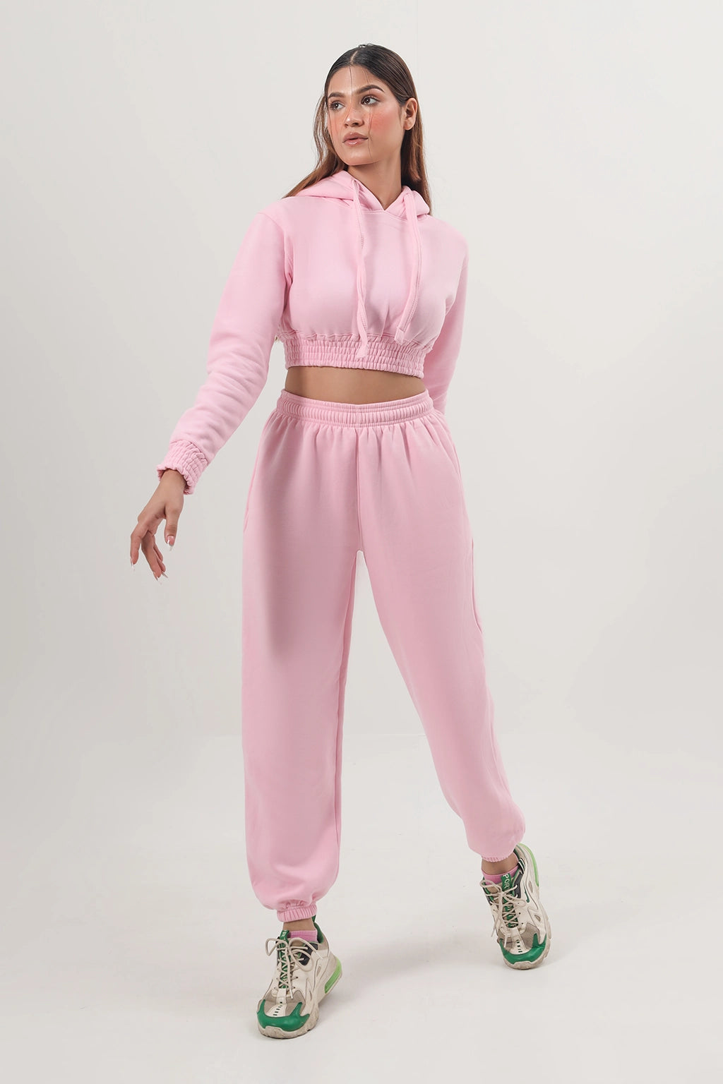 Add a soft touch to your casual look with this pink cropped tracksuit set. Made from premium cotton-spandex fleece, it delivers both comfort and a flattering fit. The cropped hoodie pairs perfectly with relaxed joggers, giving a sporty yet feminine vibe. Ideal for lounging, workouts, or casual outings.