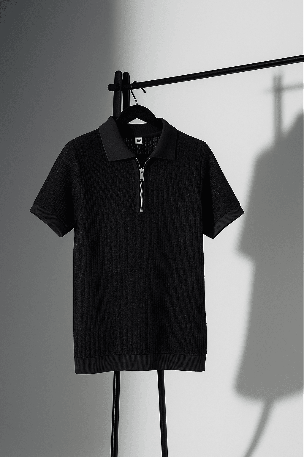 This classic black textured knit half-zip polo delivers effortless style and comfort. Its breathable open-knit design keeps you cool, while the sleek zip detail adds a modern edge. Perfect for both casual outings and smart-casual events.