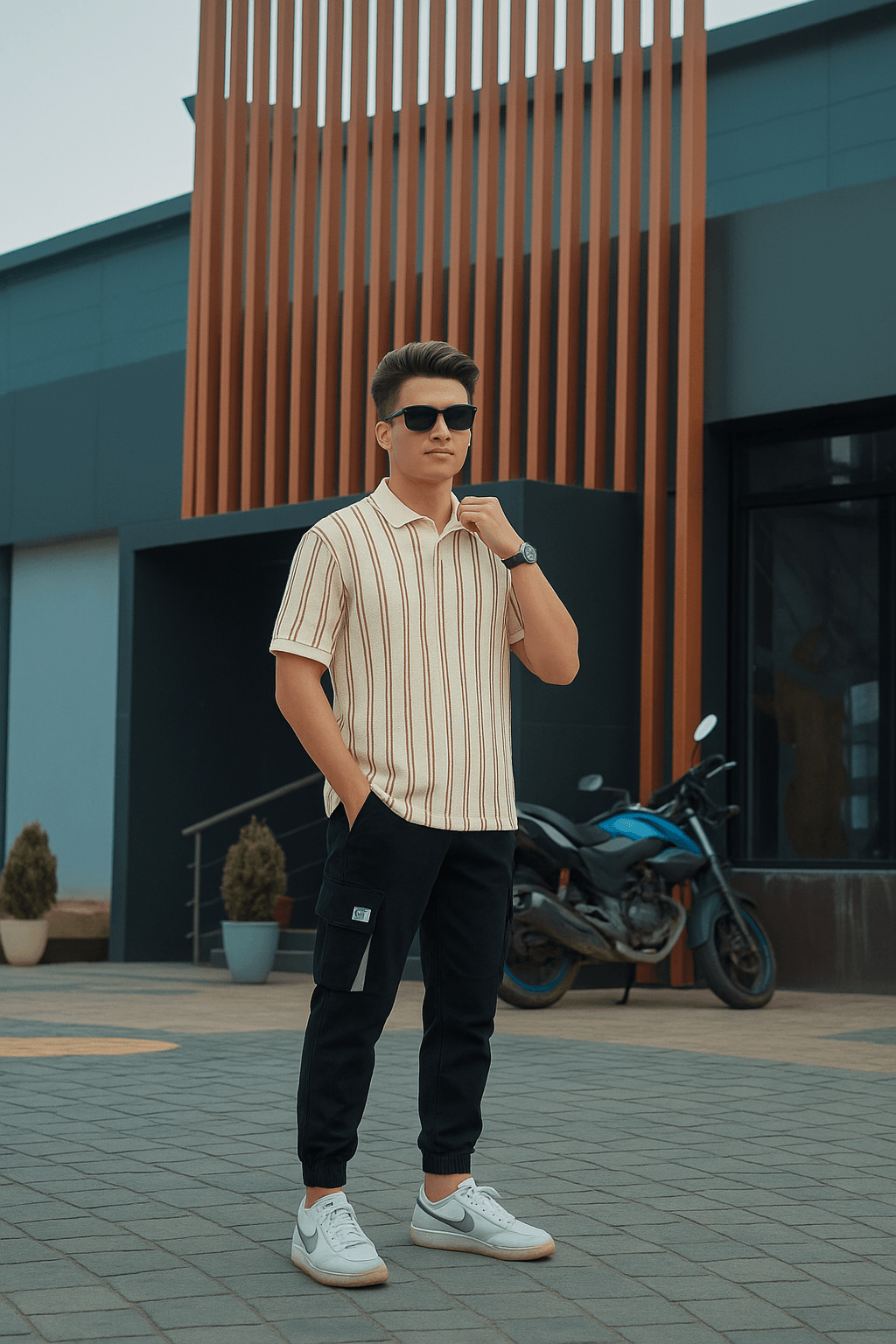 This cream and red vertical striped short-sleeve polo offers a clean, modern look with a touch of retro charm. The lightweight fabric and classic collar make it perfect for casual outings and warm-weather wear.
