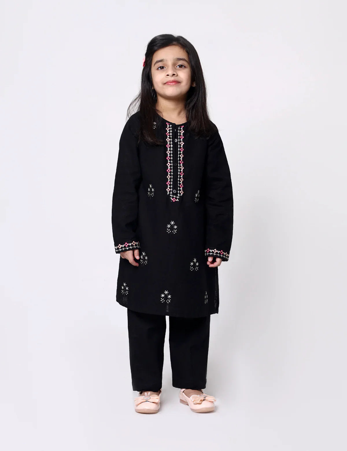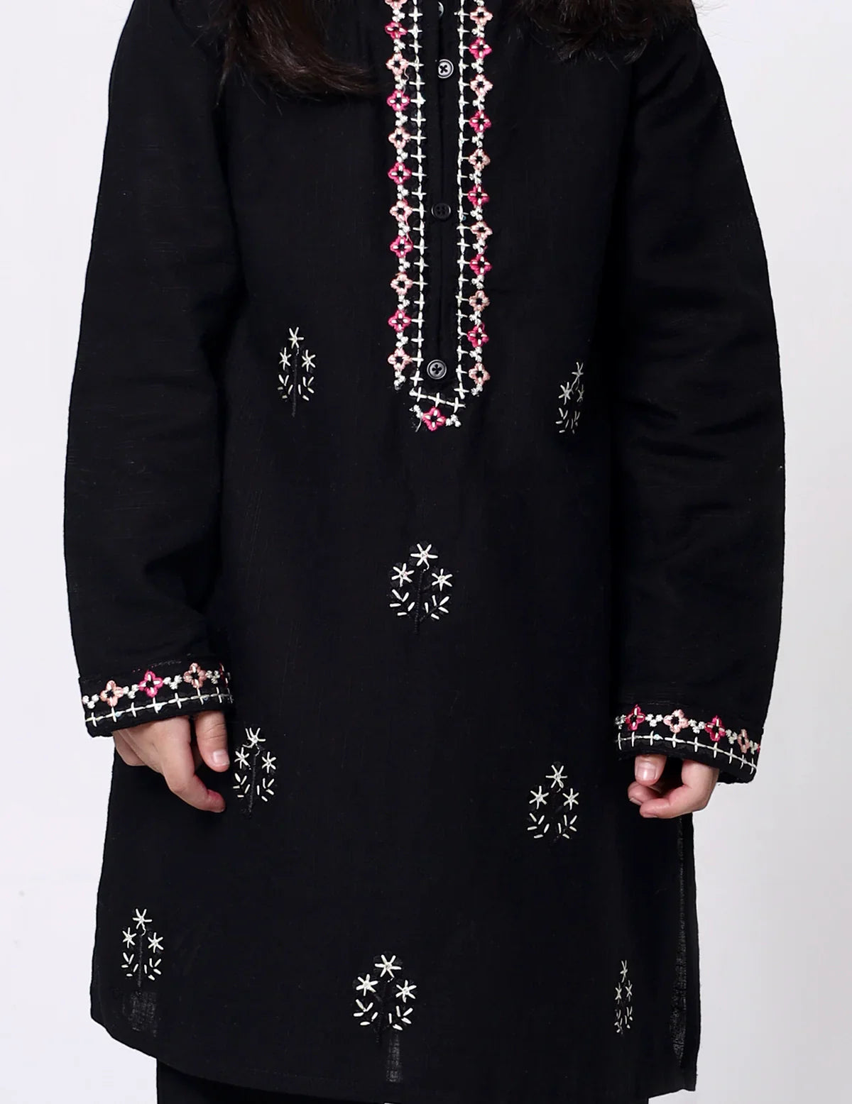 Elevate your girl’s winter wardrobe with this Black Khadar Embroidered Suit. Crafted from soft and warm khadar fabric, it features elegant embroidery, making it perfect for special occasions and casual outings.